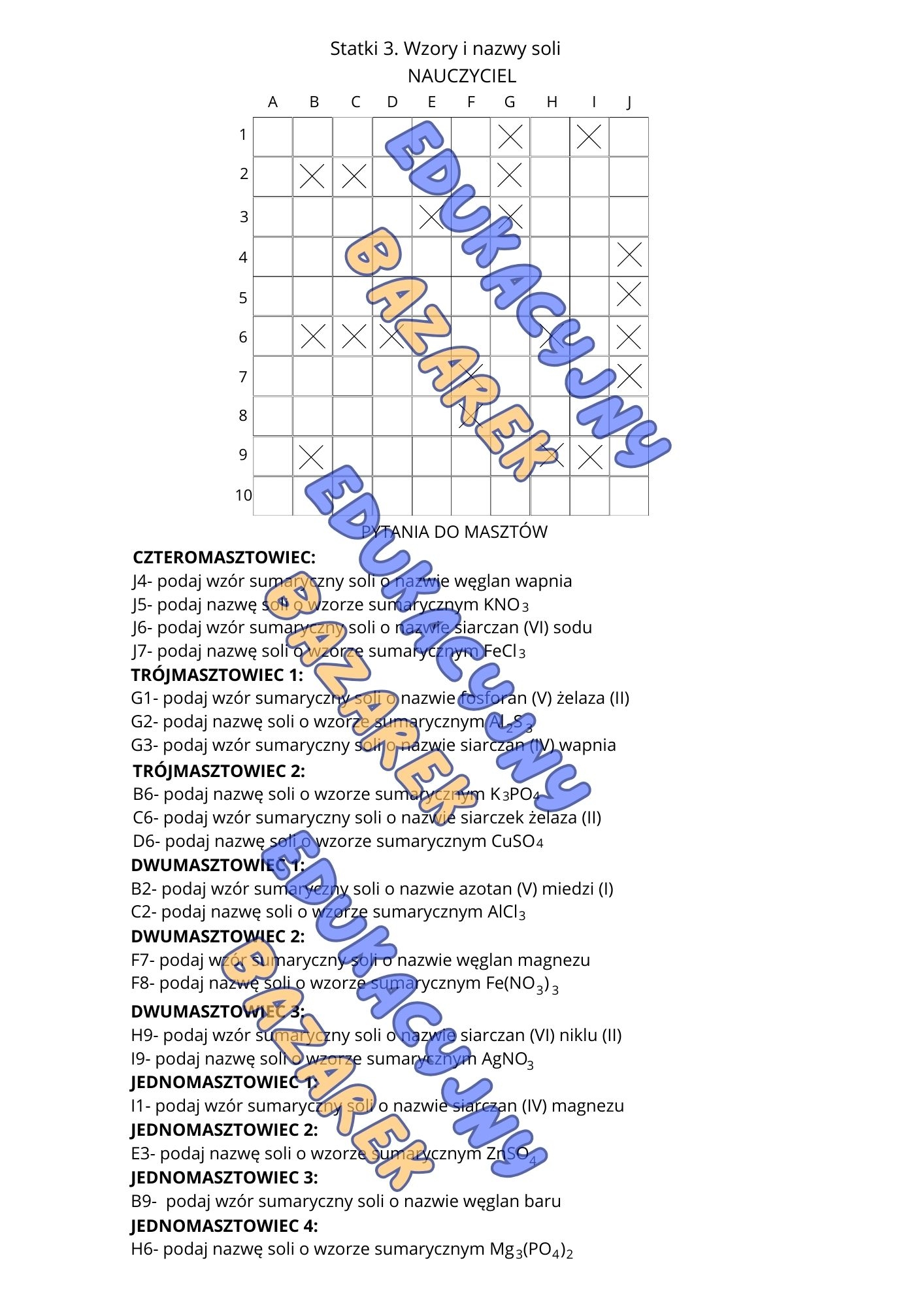 Zapraszam do gry w statki- wzory i nazwy soli kwasów nieorganicznych. Idealna karta pracy do zabawy z całą klasą. W pakiecie otrzymujecie Państwo wzór planszy dla uczniów oraz swoją kartę z naniesionymi masztami. Nauczyciel może przerysować planszę bez statków na tablicy i rozpocząć zabawę. Jeśli grupa trafi w maszt otrzymuje pytanie do niego przypisane. Dopiero poprawna odpowiedź skutkuje zdobyciem masztu. Wygrywa grupa, która zdobędzie jak najwięcej masztów.