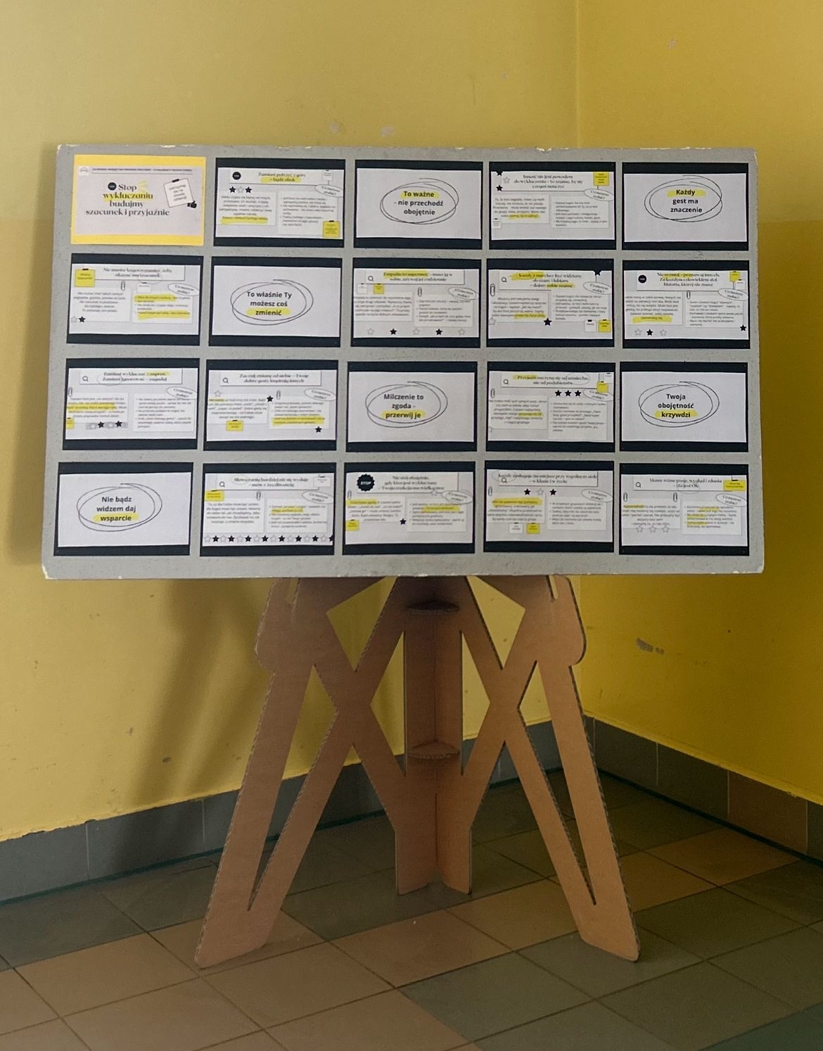 ✅Gotową prezentację - Stop wykluczaniu - budujmy szacunek i przyjaźnie (22 strony) na zdjęciu poglądowym wydrukowana prezentacja przyklejona do czarnych kartek
