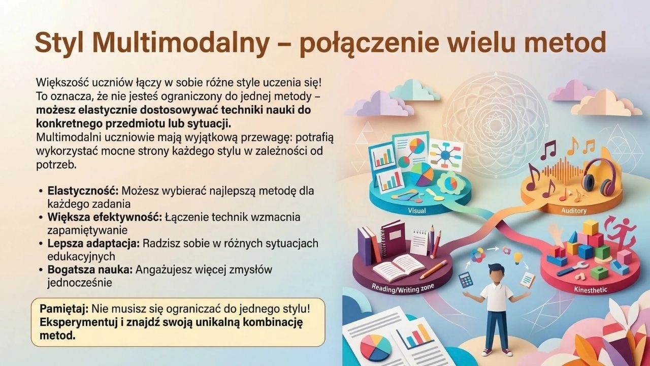 W dalszej części omówione są poszczególne style. Najpierw pojawia się charakterystyka wzrokowca – osoby uczącej się przez obrazy, wykresy, kolory i schematy (slajd 5), a potem konkretne wskazówki dla wzrokowca, takie jak mapy myśli, zakreślacze, infografiki i materiały wideo (slajd 6). Kolejne plansze dotyczą słuchowca – ucznia, który najlepiej zapamiętuje przez słuchanie, mówienie i dyskusję (slajd 7), oraz praktycznych metod pracy: nagrywanie, odsłuchiwanie, audiobooki i rozmowy z innymi (slajd 8). Następnie materiał opisuje styl czytanie i pisanie, czyli uczenie się przez tekst, notatki, listy i instrukcje pisemne (slajd 9), a potem podaje skuteczne wskazówki dla osób lubiących pracę z tekstem: przepisywanie własnymi słowami, konspekty, komentarze na marginesach i streszczenia (slajd 10). Dalej pojawia się charakterystyka kinestetyka – osoby uczącej się przez ruch, eksperymentowanie, dotyk i działanie (slajd 11), a następnie praktyczne techniki dla kinestetyka, takie jak nauka w ruchu, tworzenie modeli, używanie przedmiotów i częste przerwy na aktywność (slajd 12). Kolejny slajd pokazuje, że wiele osób ma styl multimodalny, czyli łączy różne sposoby uczenia się i korzysta z wielu metod jednocześnie (slajd 13). Następnie materiał przechodzi do cyklu Kolba, pokazując uczenie się przez doświadczenie, refleksję, teorię i eksperymentowanie (slajd 14), a potem omawia cztery typy uczniów według Kolba: aktywistę, refleksyjnego, teoretyka i pragmatyka (slajd 15). Końcowe plansze rozszerzają temat o pracę mózgu: pokazują, jak uczy się mózg, czym jest neuroplastyczność oraz jaką rolę odgrywają emocje i sen w zapamiętywaniu (slajd 16), dlaczego ruch wspiera pracę mózgu i koncentrację (slajd 17), a także jak wielkie znaczenie mają powtórki i uczenie się na błędach (slajd 18). Całość zamyka slajd pomagający uczniowi znaleźć własny styl uczenia się poprzez zadawanie sobie pytań, obserwację siebie i eksperymentowanie z różnymi technikami (slajd 19).