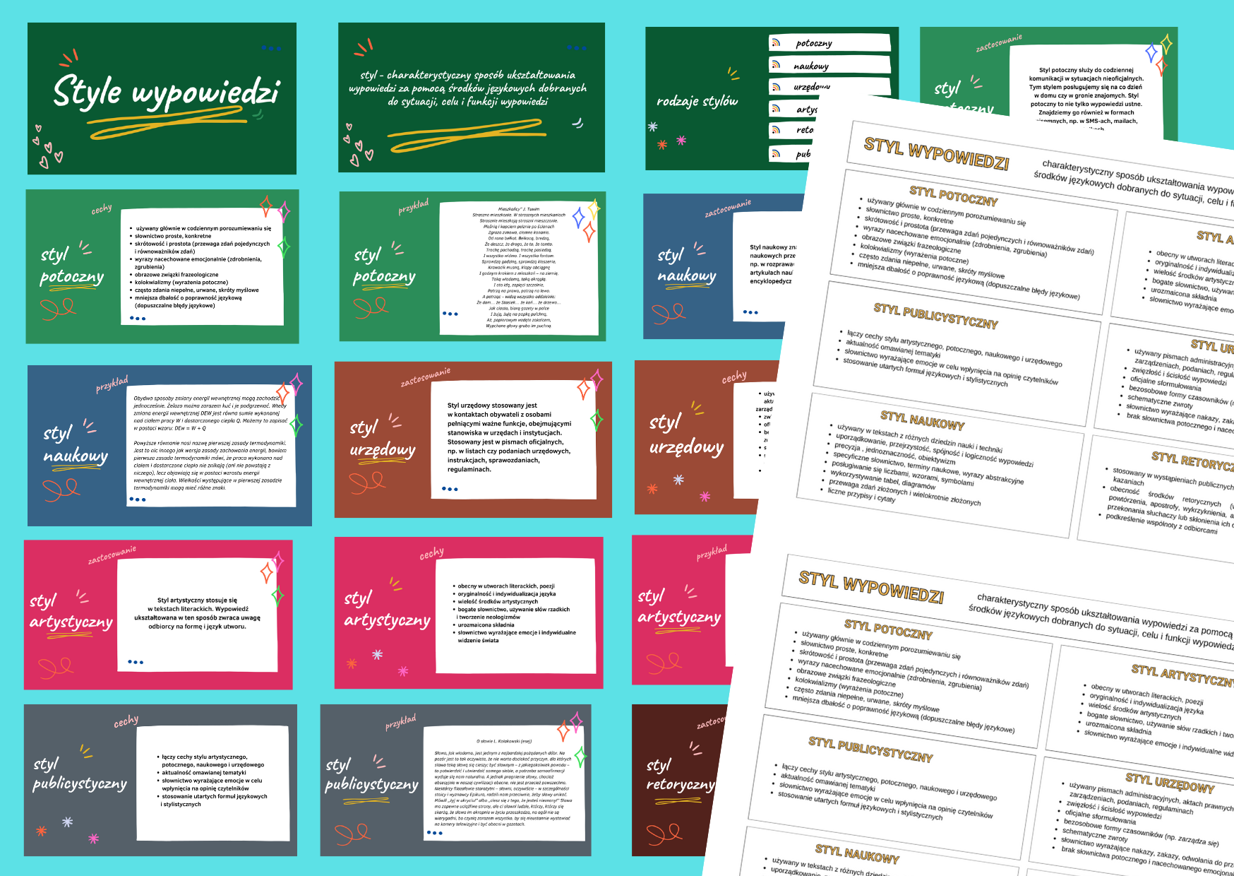 Materiał zawiera prezentację ( 21 slajdów) oraz wklejkę dotyczące stylów wypowiedzi: potocznego, artystycznego, naukowego, urzędowego, publicystycznego, retorycznego ( nazwa stylu, zastosowanie, cechy i przykład).