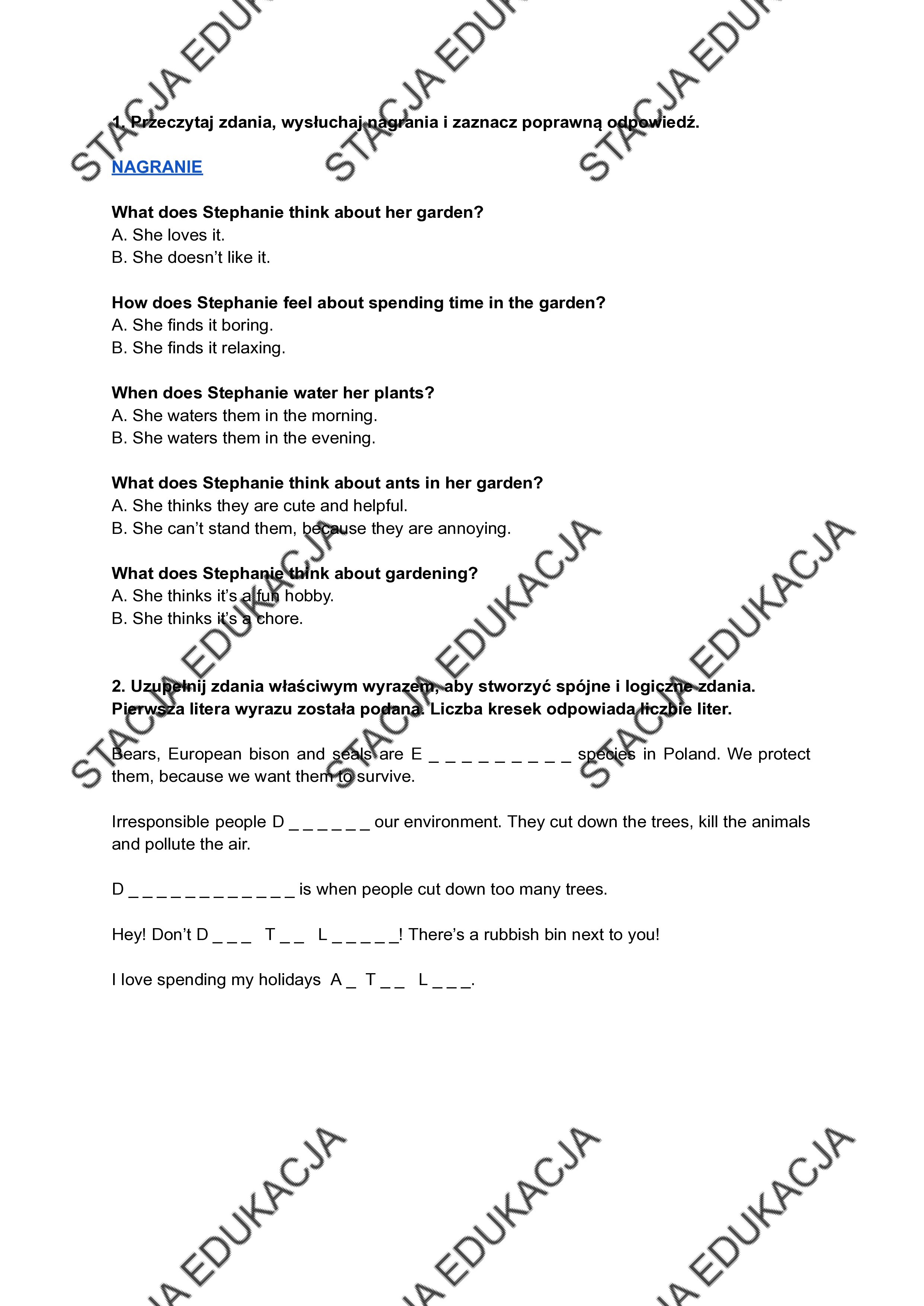 Karta pracy to idealny materiał do ćwiczeń językowych dla uczniów klas 6. Zestaw zadań obejmuje różnorodne zagadnienia gramatyczne, słownictwo oraz umiejętności rozumienia ze słuchu. Została opracowana w taki sposób, aby utrwalać kluczowe tematy, takie jak ochrona środowiska i codzienne czynności, jednocześnie rozwijając umiejętności używania czasu Present Simple oraz Present Continuous. Karta pracy zawiera:
