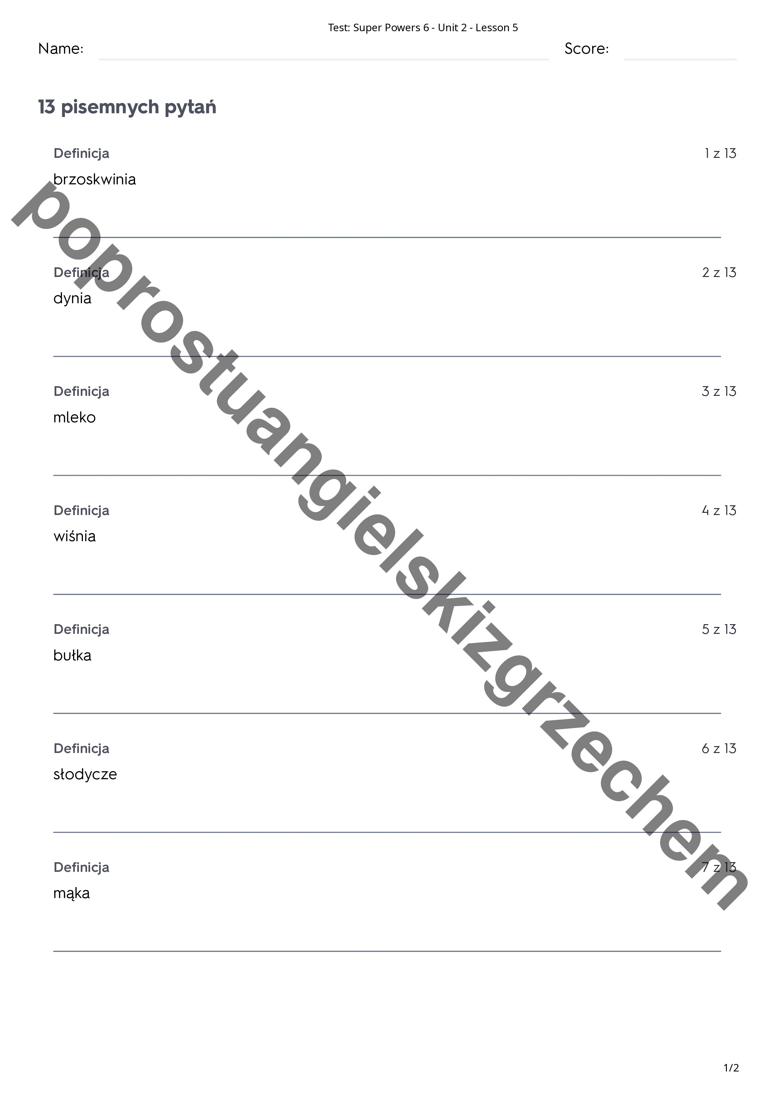 Zestaw zawiera 72 słówka z działu drugiego do podręcznika Super Powers 6. Testy podzielone są na 5 podrozdziałów, a każdy z nich na 4 kategorie zadań (prawda/fałsz, dopasuj, wielokrotny wybór, pisemny)