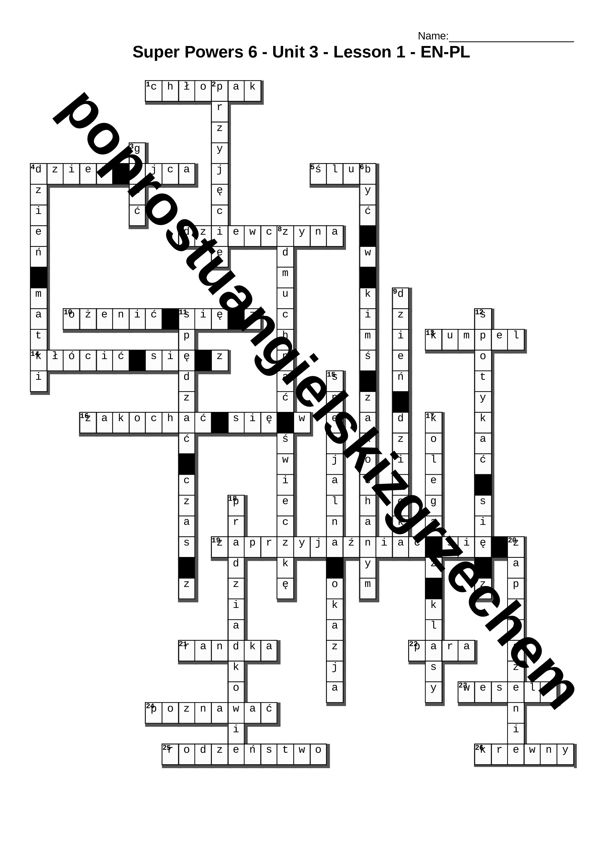 Zestaw zawiera łącznie 6 krzyżówek (3x PL-EN + 3x EN-PL) oraz klucz z odpowiedziami. Zakres słówek obejmuje dział trzeci z podręcznika Super Powers 6. Krzyżówki składają się od kilku (zwykle nie mniej niż 8) do maksymalnie 30 słówek.