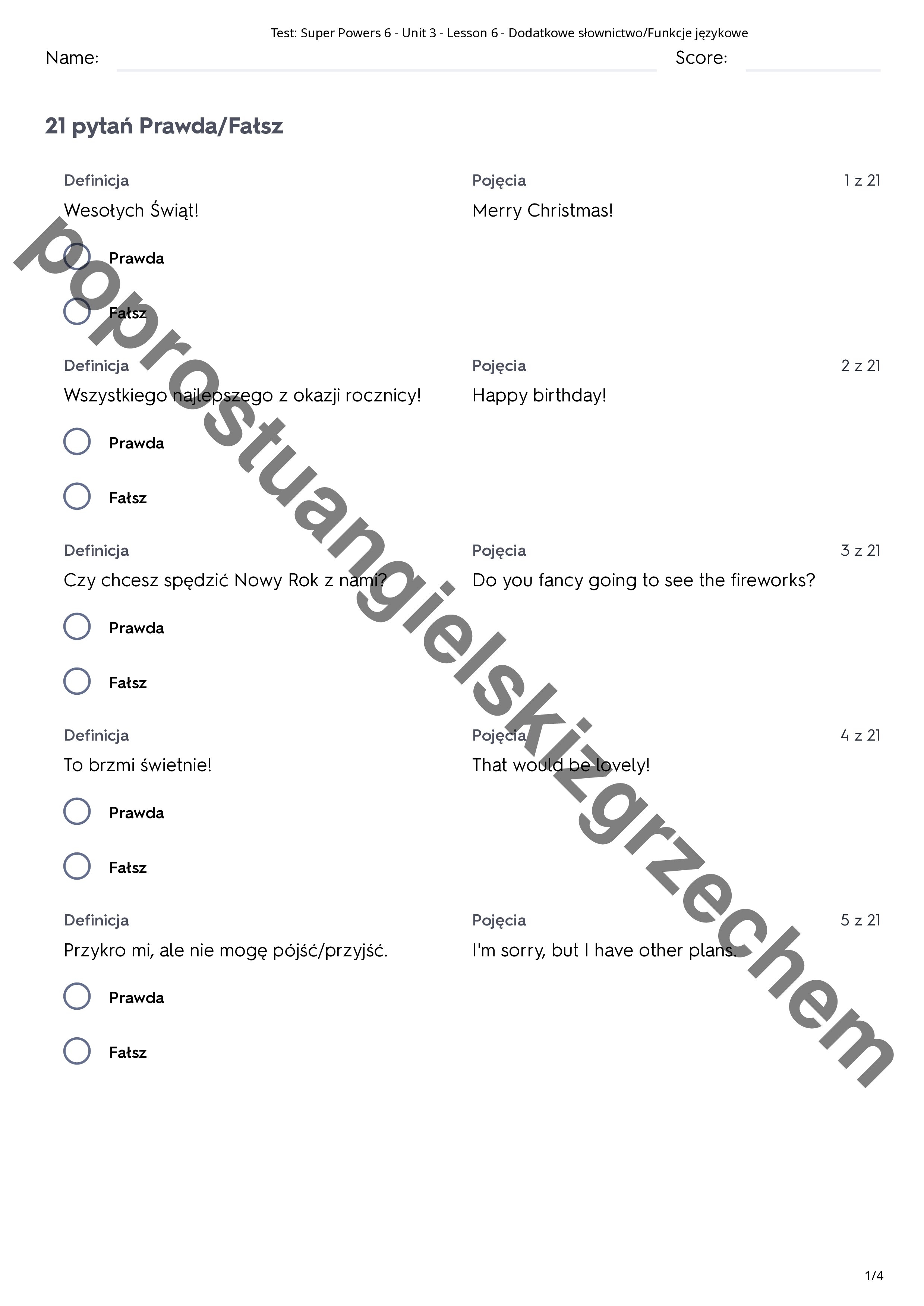 Zestaw zawiera 74 słówka z działu trzeciego do podręcznika Super Powers 6. Testy podzielone są na 4 podrozdziały, a każdy z nich na 4 kategorie zadań (prawda/fałsz, dopasuj, wielokrotny wybór, pisemny)
