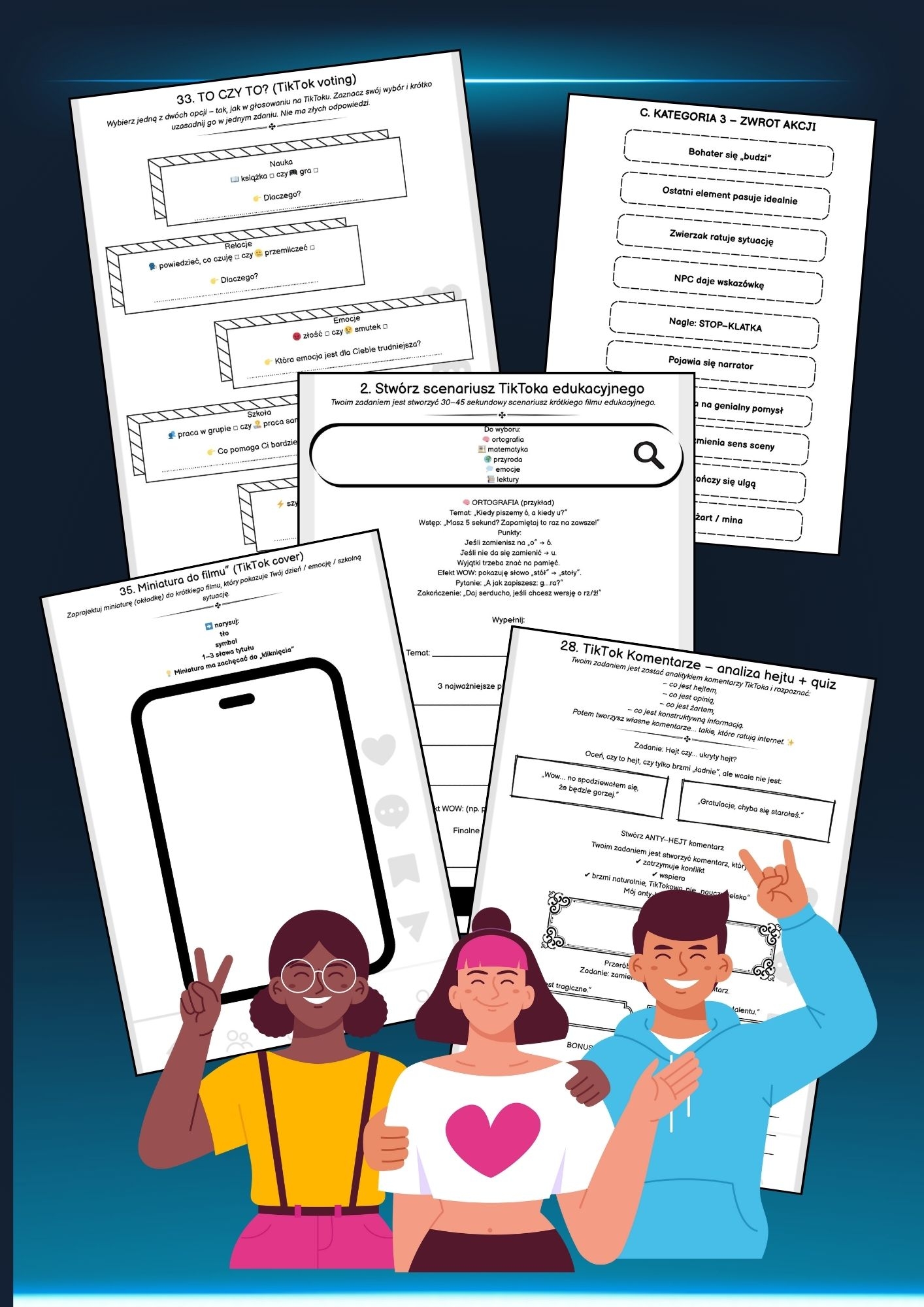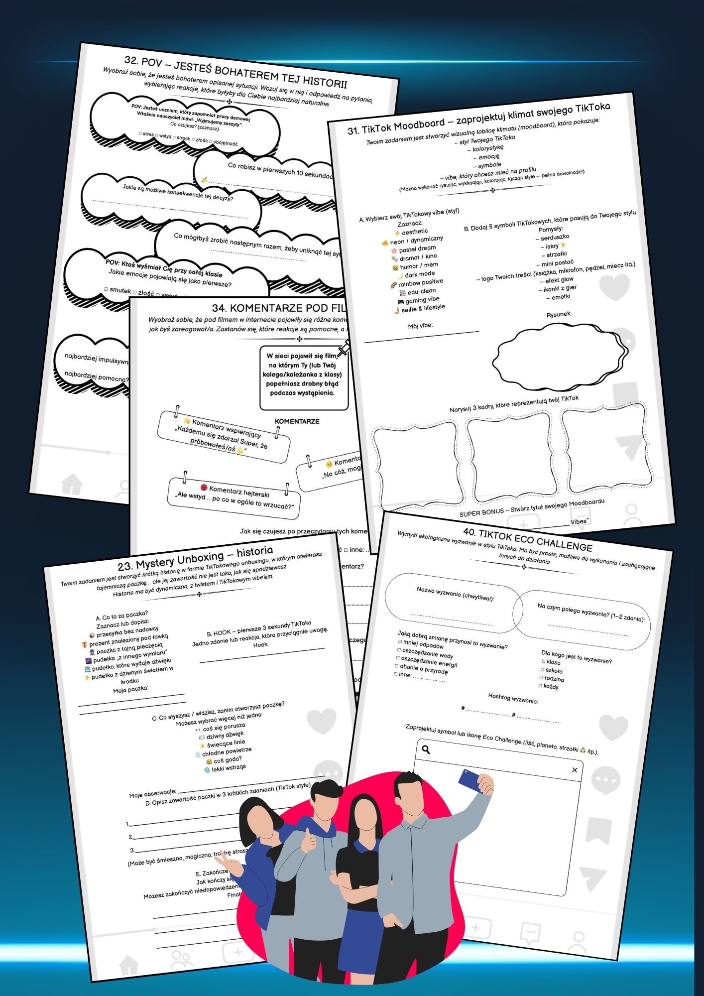 Nowoczesny pakiet 40 kart pracy inspirowanych trendami TikToka, który angażuje uczniów od pierwszej minuty. Krótkie, dynamiczne zadania łączą pisanie, rysowanie, refleksję i zabawę, dzięki czemu uczniowie pracują chętnie i bez oporu. ✔ rozwija kreatywne myślenie, język i wyobraźnię ✔ wspiera emocje, relacje i komunikację ✔ idealny na 5–10 minut lekcji ✔ sprawdza się na języku polskim, godzinie wychowawczej, TUS i zastępstwach 📄 40 gotowych kart pracy PDF do druku 🎨 zadania pisemne i plastyczne 🎓 klasy 4–8 🎁 GRATIS! TikTok Story Generator – Losuj i twórz historię – kreatywna zabawa z losowaniem bohatera, miejsca i problemu – idealna do rozwijania opowiadań i wyobraźni