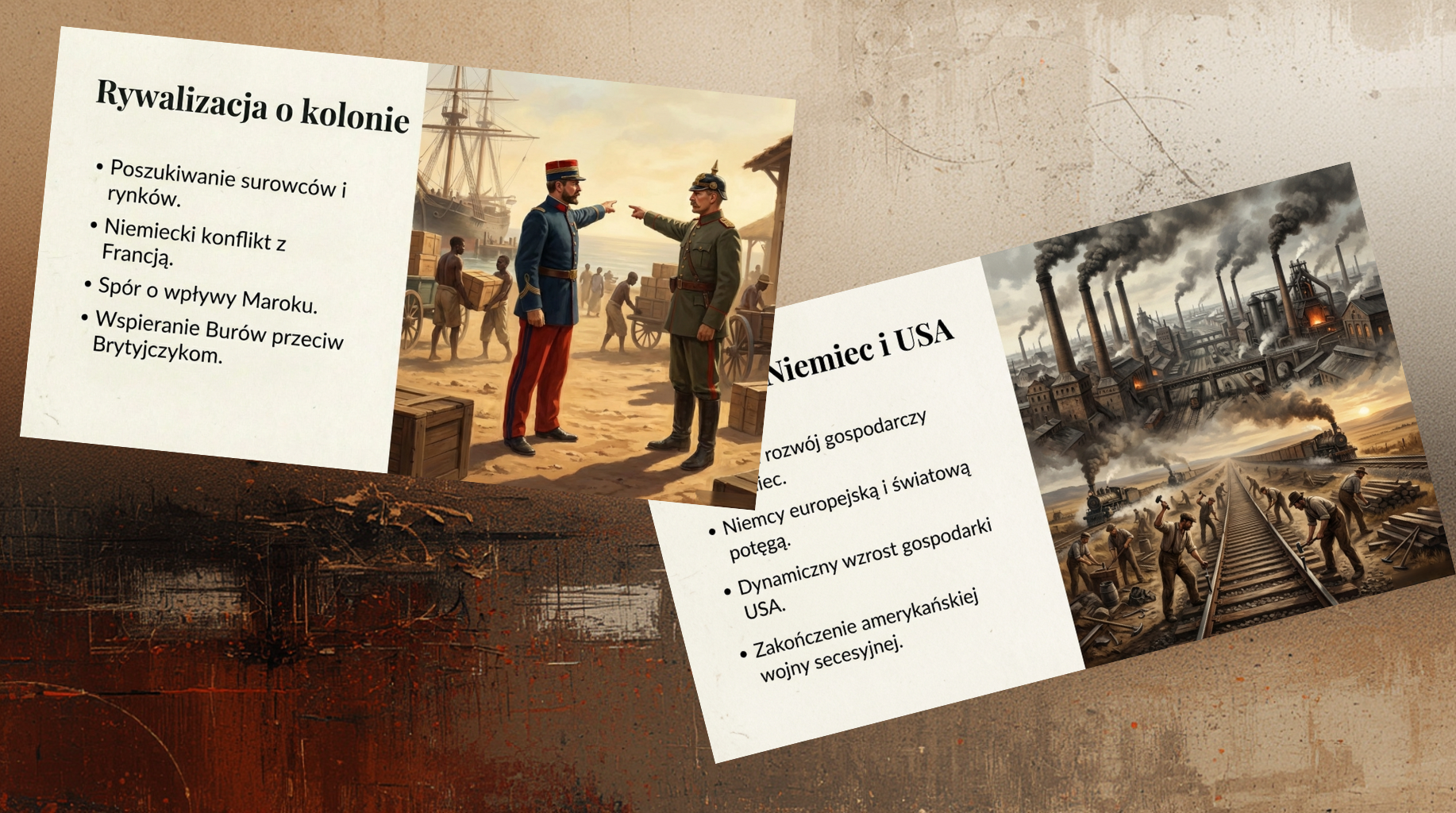 Wysoka jakość wizualna: Na każdym slajdzie znajduje się ilustracja lub zdjęcie, które pomaga uczniom lepiej zrozumieć i zapamiętać omawiane procesy historyczne.
