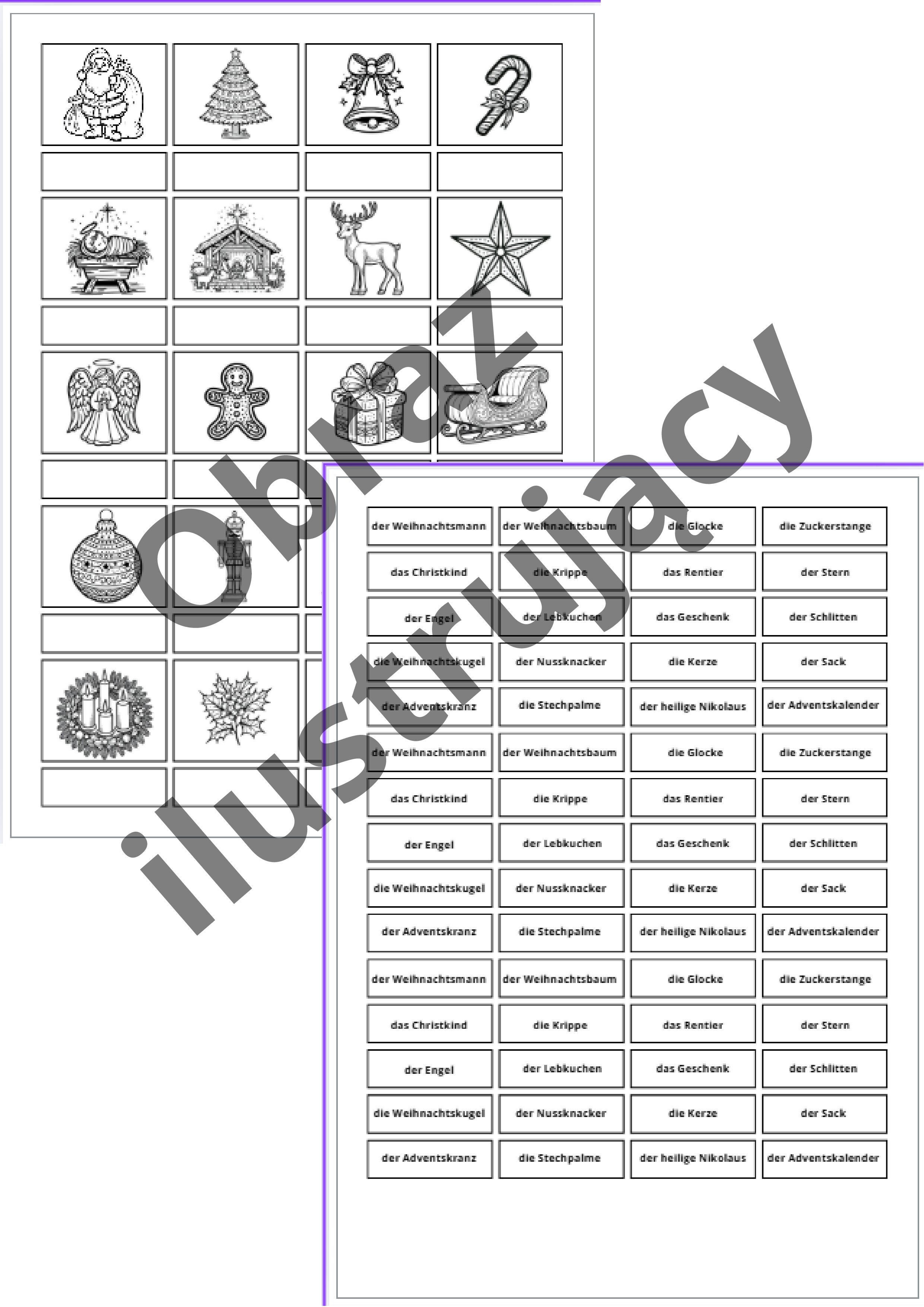 Z tej praktycznej pomocy do nauki niemieckiego słownictwa świątecznego można korzystać w prosty sposób. Należy wyciąć niemieckie słowa wraz z rodzajnikami, a następnie dopasować i przykleić je do odpowiednich świątecznych ilustracji. Obrazki można pokolorować według własnej wyobraźni. To skuteczna metoda na zapamiętanie niemieckich nazw świątecznych elementów takich jak Weihnachtsmann, Geschenk czy Adventskranz. Materiały można również wykorzystać do tworzenia własnych kompozycji lub gier językowych. Pomoc sprawdza się zarówno w nauce indywidualnej, jak i podczas zajęć grupowych. Obrazki nie są gotowymi szblonami z Canvy, są nietuzinkowe i niepowtarzalne :)