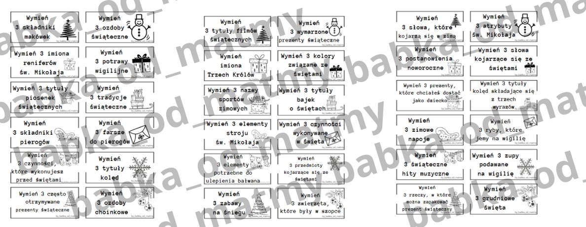 Świąteczne 5 sekund to doskonała zabawa dla całej klasy na świąteczną godzinę wychowawcą i/lub na wigilijkę klasową (a może i rodzinną? :)). Co potrzeba? - odmierzacz czasu (może być oryginalny z gry "5 sekund", bądź znaleziony w Internecie) - zdobądź we własnym zakresie :) - zestaw kart - do wydruku - dobry humor Gra zawiera 36 pytań związanych ze świętami, zimą, grudniem... :) P.S. Zabawa NIE JEST matematyczna! :)