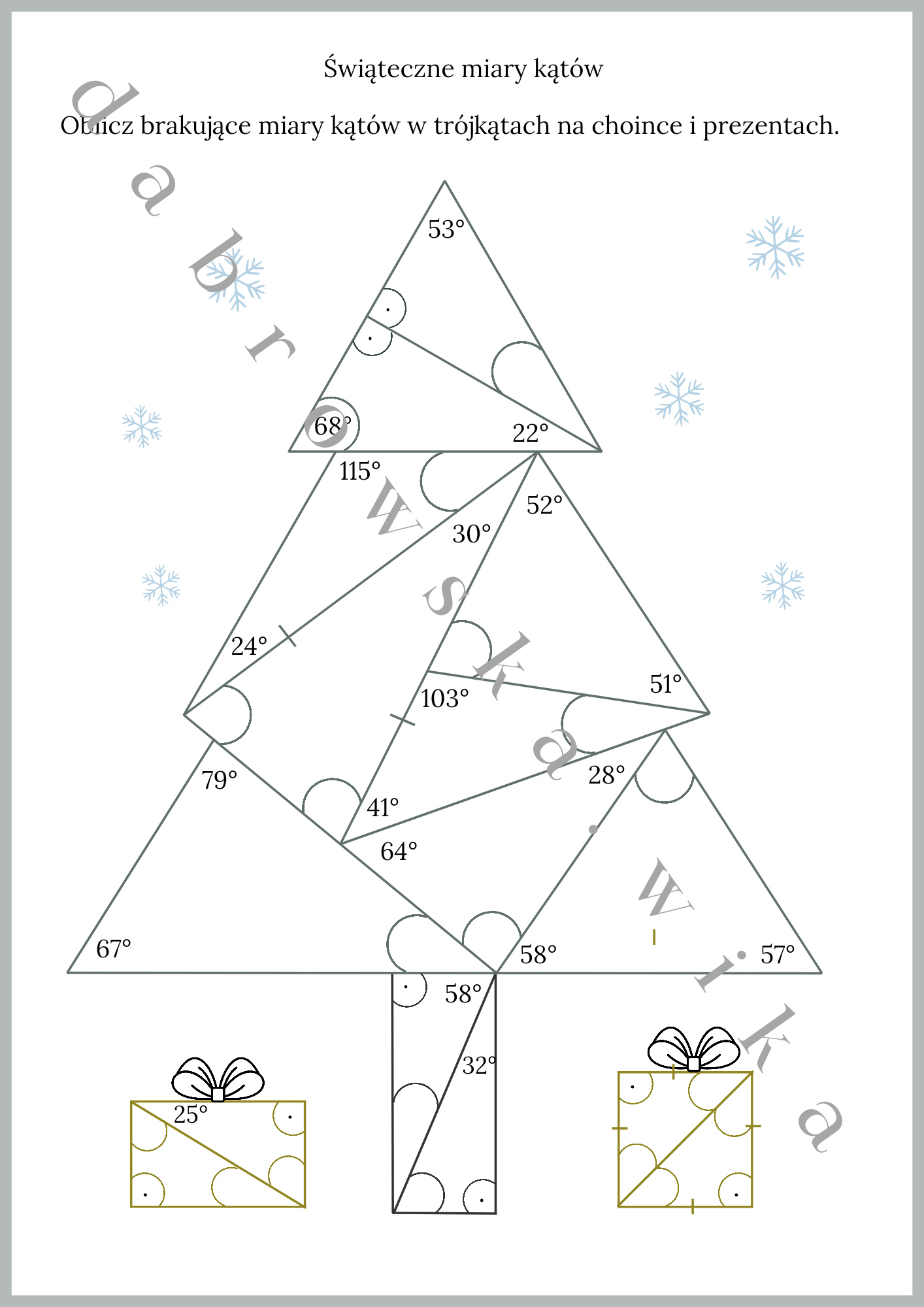 Zadaniem ucznia jest obliczenie i wpisanie brakujących miar kątów w trójkątach na choince i na prezentach.