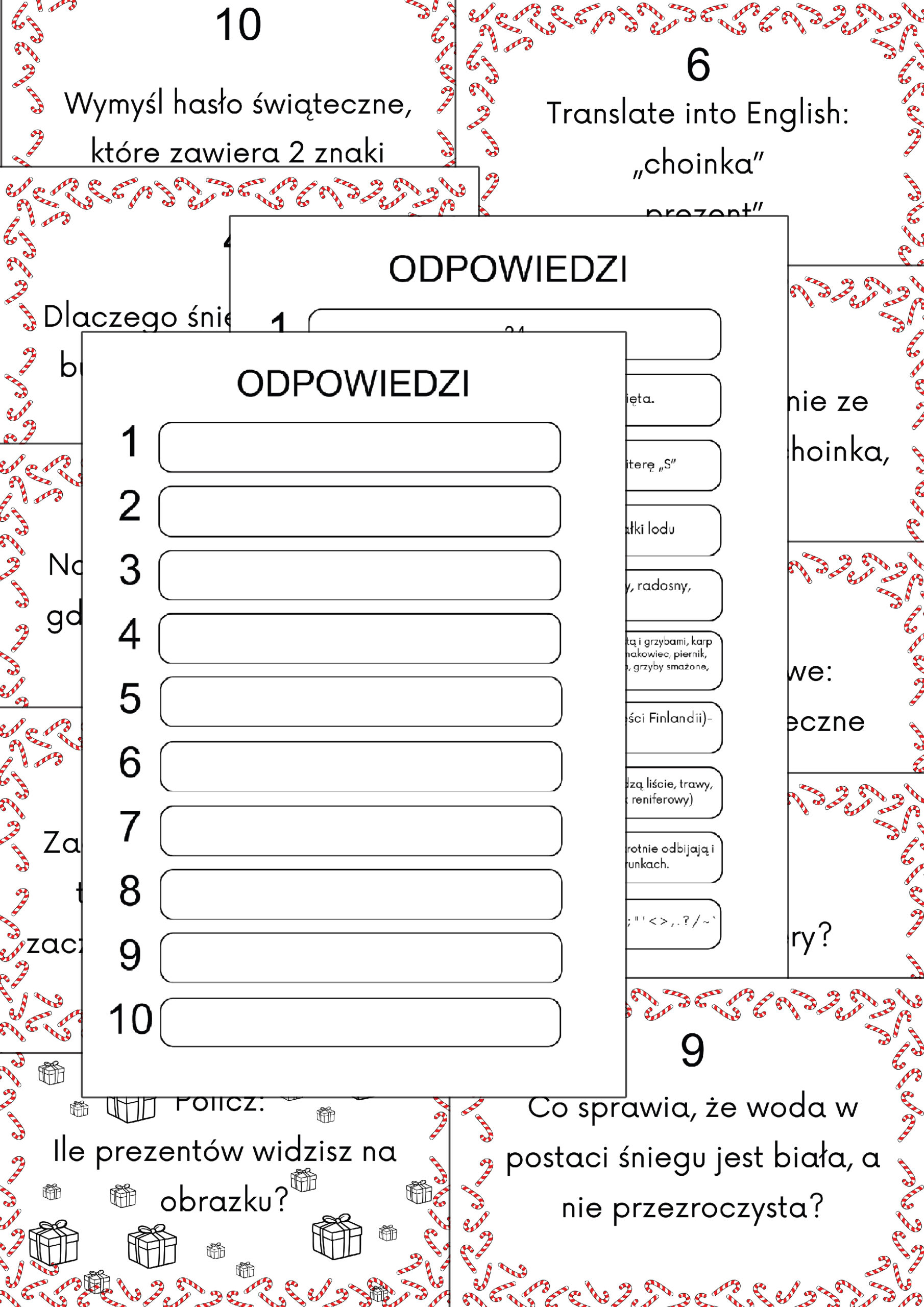 Materiął zawiera gotową kartę zadań do przeprowadzenia świątecznych podchodów dla uczniów klas 4–8. Zestaw składa się z różnorodnych poleceń związanych ze świętami, zimą i wiedzą ogólną. Uczniowie wypełniają kartę, odnajdując odpowiedzi na zadania rozmieszczone w szkole lub rozwiązując je samodzielnie podczas gry terenowej.