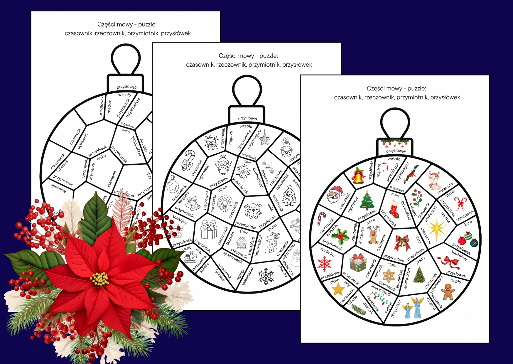 🎄 Świąteczne puzzle – Bombki: części mowy (czasownik, rzeczownik, przymiotnik, przysłówek)🎄