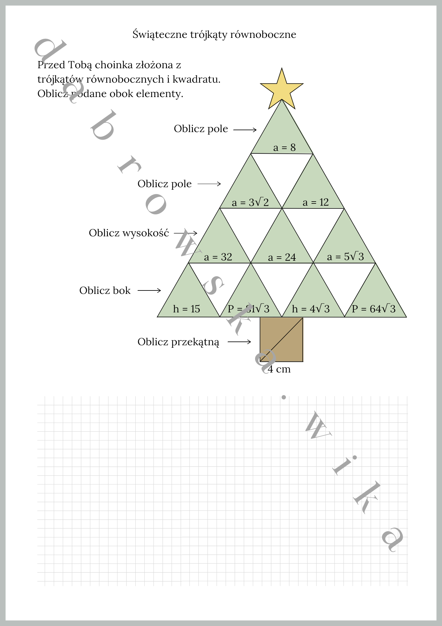 Ćwiczenie rozwija umiejętności stosowania wzorów na pole trójkąta równobocznego, wysokość oraz przekątną kwadratu. Jest to doskonała okazja do utrwalenia geometrii w ciekawy i świąteczny sposób.
