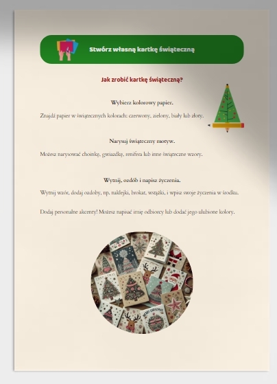 - Warsztaty DIY: Tworzenie własnych kart świątecznych, ozdób lub zakładek do książek (20 minut).