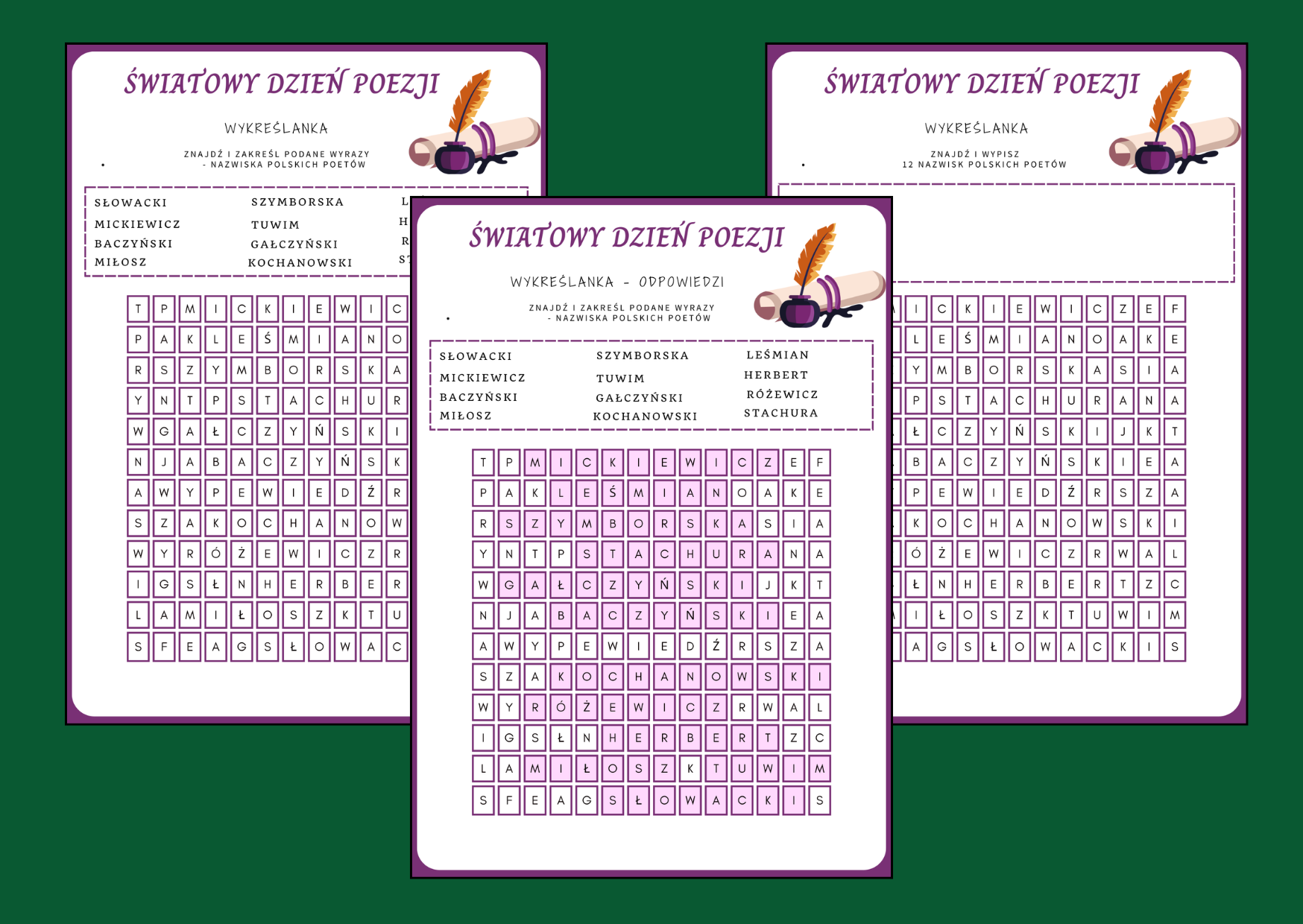 Materiał zawiera wykreślankę dotyczącą Światowego Dnia Poezji (3 wersje: z odpowiedziami, bez odpowiedzi, bez wyrazów do odnalezienia). Zadaniem uczniów jest wyszukanie/wypisanie wyrazów – 12 nazwisk polskich poetów.