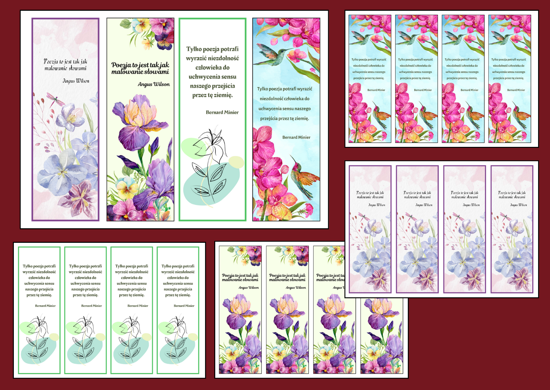 Zestaw 4 rodzajów zakładek do książek z cytatami o poezji - nie tylko z okazji Dnia Poezji. Składa się z 5 stron: na pierwszej stronie zamieszczony jest zestaw 4 zakładek, pozostałe strony przeznaczone są dla poszczególnych wersji. Warto po wydrukowaniu i wycięciu zakładki zalaminować (ewentualnie wydrukować na grubszym papierze).