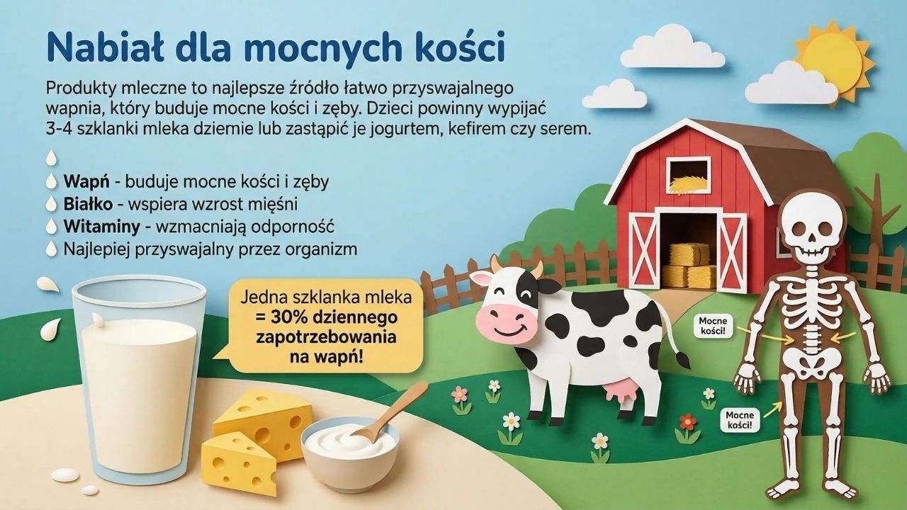 W dalszej części materiał omawia zasady regularnego i zróżnicowanego odżywiania, zachęcając do spożywania kolorowych warzyw i owoców oraz regularnych posiłków (slajd 6). Następnie przedstawia rolę produktów zbożowych jako źródła energii i ważnych składników odżywczych dla organizmu (slajd 7). Kolejna plansza opisuje znaczenie nabiału dla zdrowych kości i zębów, podkreślając rolę wapnia w rozwoju organizmu (slajd 8).