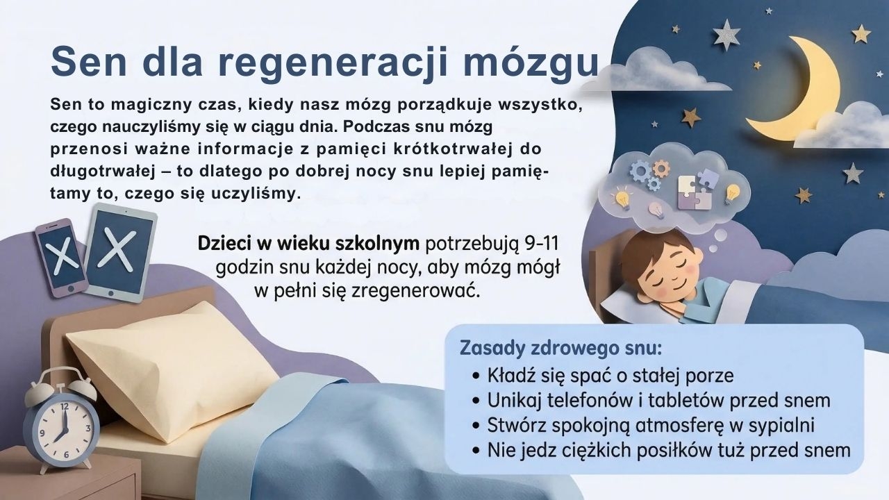 Materiał omawia także znaczenie snu dla regeneracji mózgu i pamięci, wskazując, że dzieci w wieku szkolnym potrzebują około 9–11 godzin snu każdej nocy (slajd 13). Następnie przedstawia zasady higieny cyfrowej, czyli ograniczania czasu spędzanego przed ekranem i zachowania równowagi między światem online a aktywnością fizyczną (slajd 14).