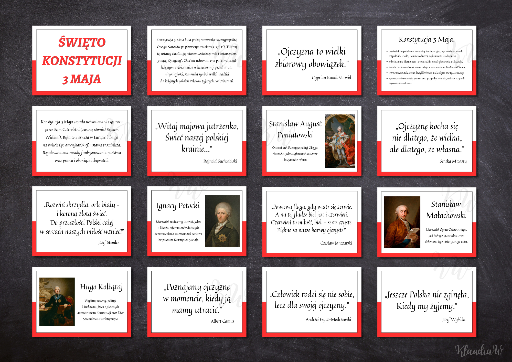 Gotowa gazetka na Święta Majowe/Święto Konstytucji 3 Maja. W zestawie znajduje się 16 plansz w formacie A4.