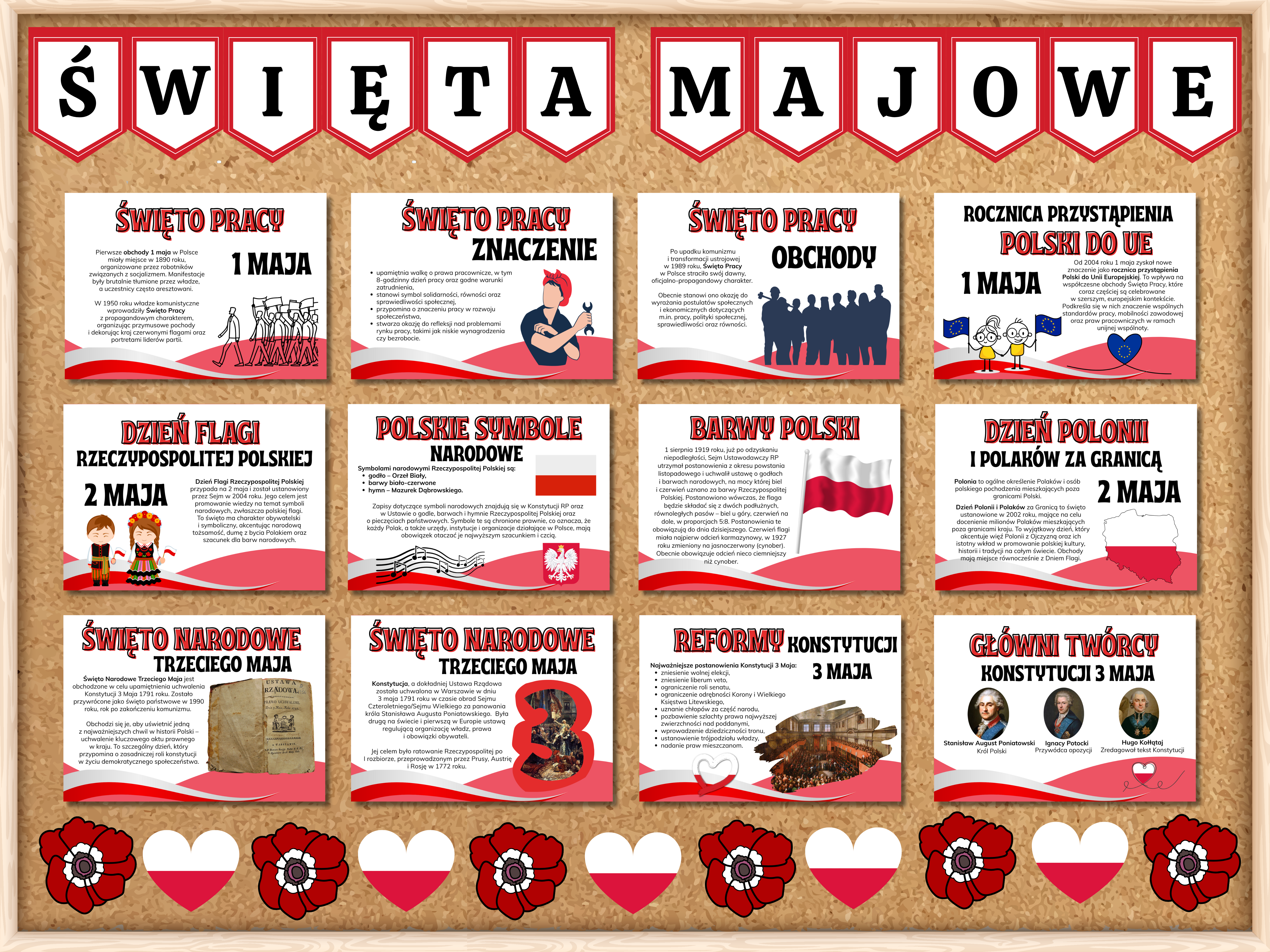 Zestaw edukacyjny poświęcony obchodom Świąt Majowych w Polsce. Materiał składa się z 12 plansz A4, które w przystępny sposób omawiają kluczowe święta i związane z nimi zagadnienia historyczne oraz społeczne.