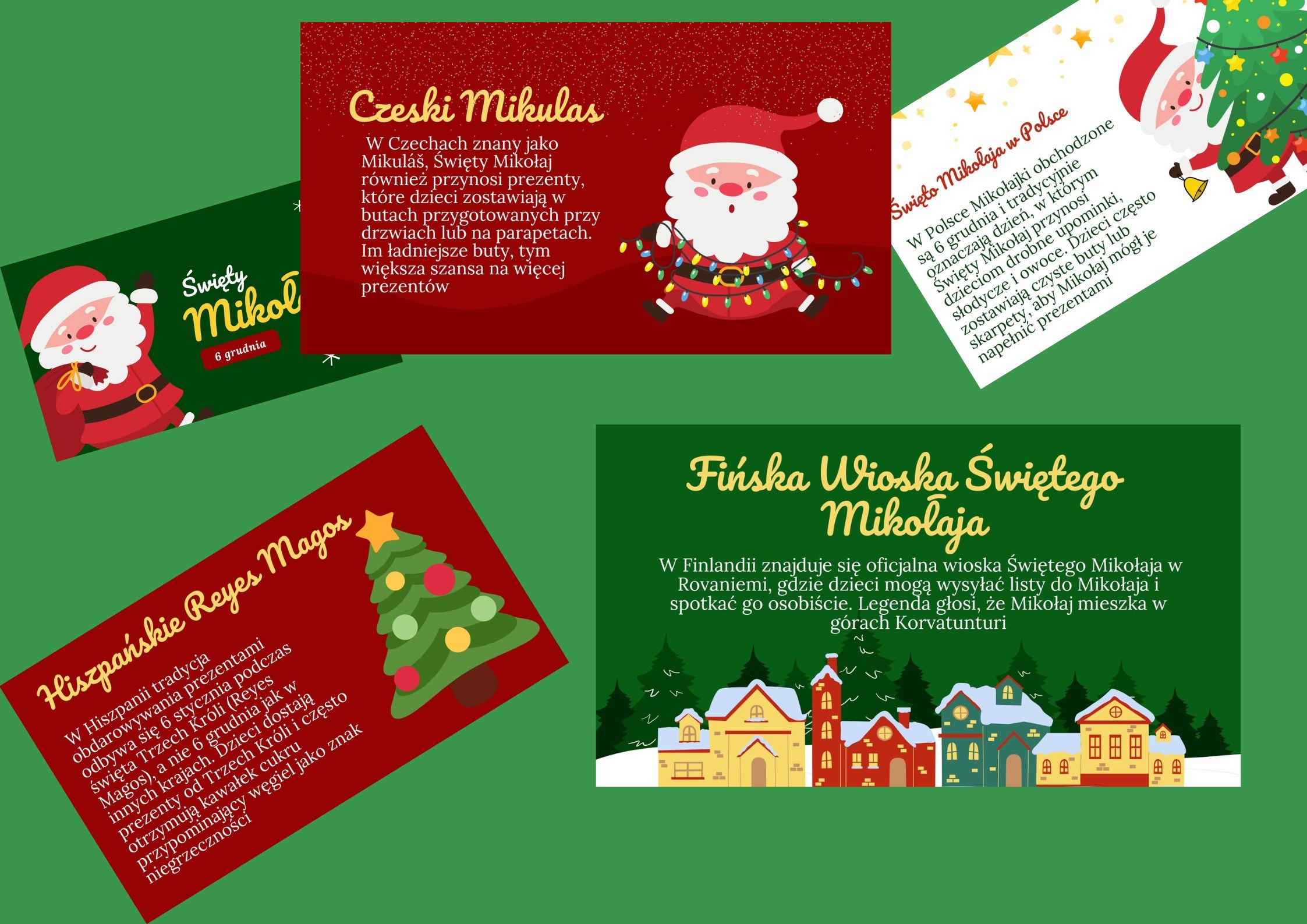 Prezentacja online z ciekawostkami na temat Świętego Mikołaja w Polsce oraz innych krajach Europy. Informacje o tradycjach związanych z obdarowywaniem prezentami świątecznymi w innych krajach na 11 kolorowych kartkach. Prezentacja doskonale nadaje się również do wydrukowania oraz zalaminowania aby pięknie się prezentować na gazetce klasowej lub szkolnej.