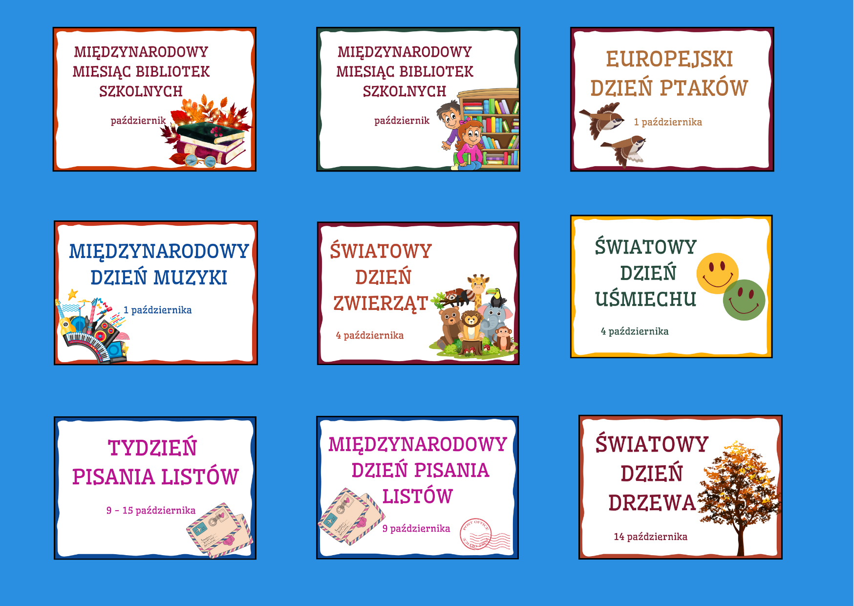 Międzynarodowy Miesiąc Bibliotek Szkolnych (2 wersje), Europejski Dzień Ptaków, Międzynarodowy Dzień Muzyki, Światowy Dzień Zwierząt, Światowy Dzień Uśmiechu, Tydzień Pisania Listów, Międzynarodowy Dzień Pisania Listów, Światowy Dzień Drzewa, Dzień Nauczyciela, Dzień Listonosza, Dzień Bez Skarpetek, Światowy Dzień Origami, Międzynarodowe Święto Roweru, Dzień Kundelka, Dzień Spódnicy, Światowy Dzień Oszczędzania.
