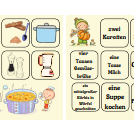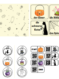 Zestaw związany z tematem święta dyni zawiera 12 wyrazów, podświetlane memo (także podano QR-kod, jak takie memo wykonać), domino z QR-kodami, zadanie: znajdź na obrazku (3 obrazki) - plansze można wydrukować lub wyświetlić na tablicy multimedialnej, tekst piosenki oraz zadania do tekstu - znane wyrazy zamieniono na obrazki, uczniowie dostają różne części zwrotek piosenki i reagują w trakcie jej słuchania, 6 zagadek odnośnie wcześniej wprowadzonego słownictwa, przepis na zupę dyniową w języku niemieckim - wraz z grą memo - składniki na zupę. Uczniowie sami mogą narysować w zeszycie przepis na zupę dyniową i spróbować w domu wykonać ją wspólnie z rodzicami. Dodatkowo 2 rebusy - zaszyfrowany alfabet wyświetlamy na tablicy multimedialnej, a uczniowie w parach lub indywidualnie rozwiązują zaszyfrowane hasła. Także dzieci mogą np. zaszyfrować w zeszycie wyrazy, które poznały w trakcie lekcji.