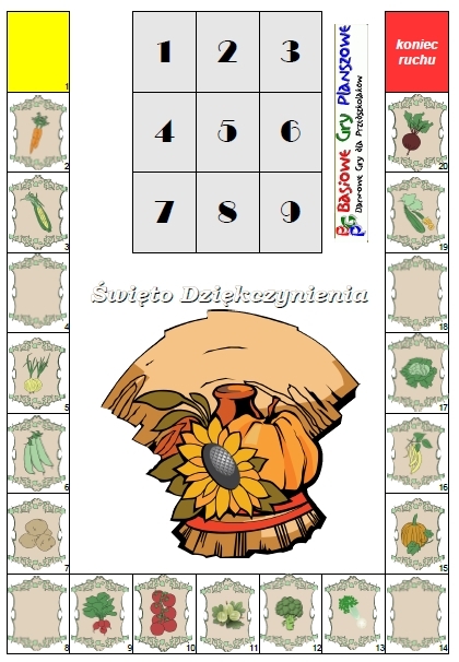 Święto Dziękczynienia to gra drużynowa dla kilku dzieci. Celem wszystkich jest zebranie 12 kart z rzeczami, którymi zapełni się świąteczny koszyk. Gra może być również wykorzystana do nauki nazw owoców i warzyw na zajęciach języka angielskiego (nazwy produktów oraz tradycja anglosaska ) oraz jako pomoc do nauki religii.