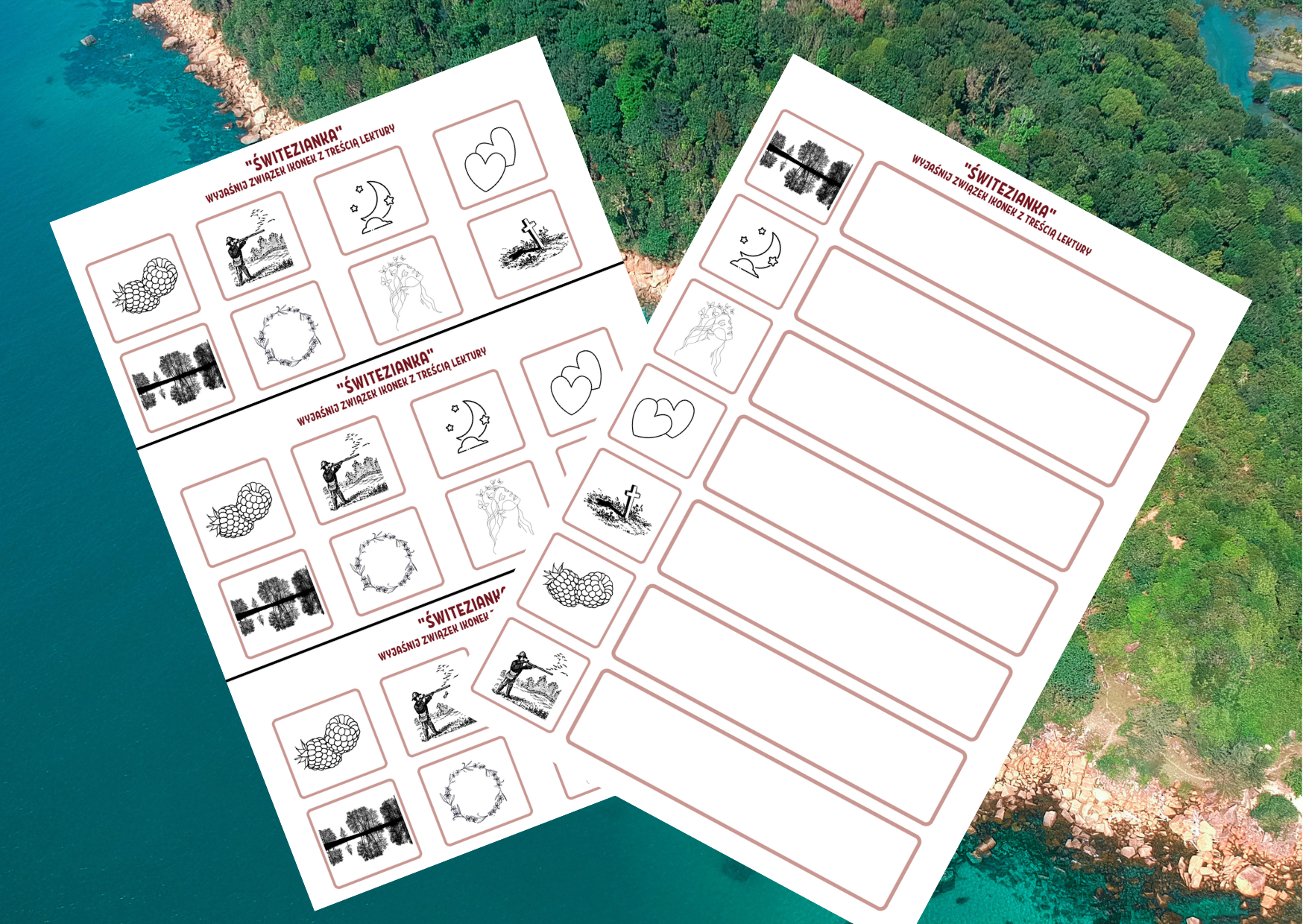 Zestaw „ŚWITEZIANKA” składa się z karty pracy oraz karty z 3 wklejkami (obie karty pdf w formacie A4 oraz png), które zawierają ikonki dotyczące treści lektury.