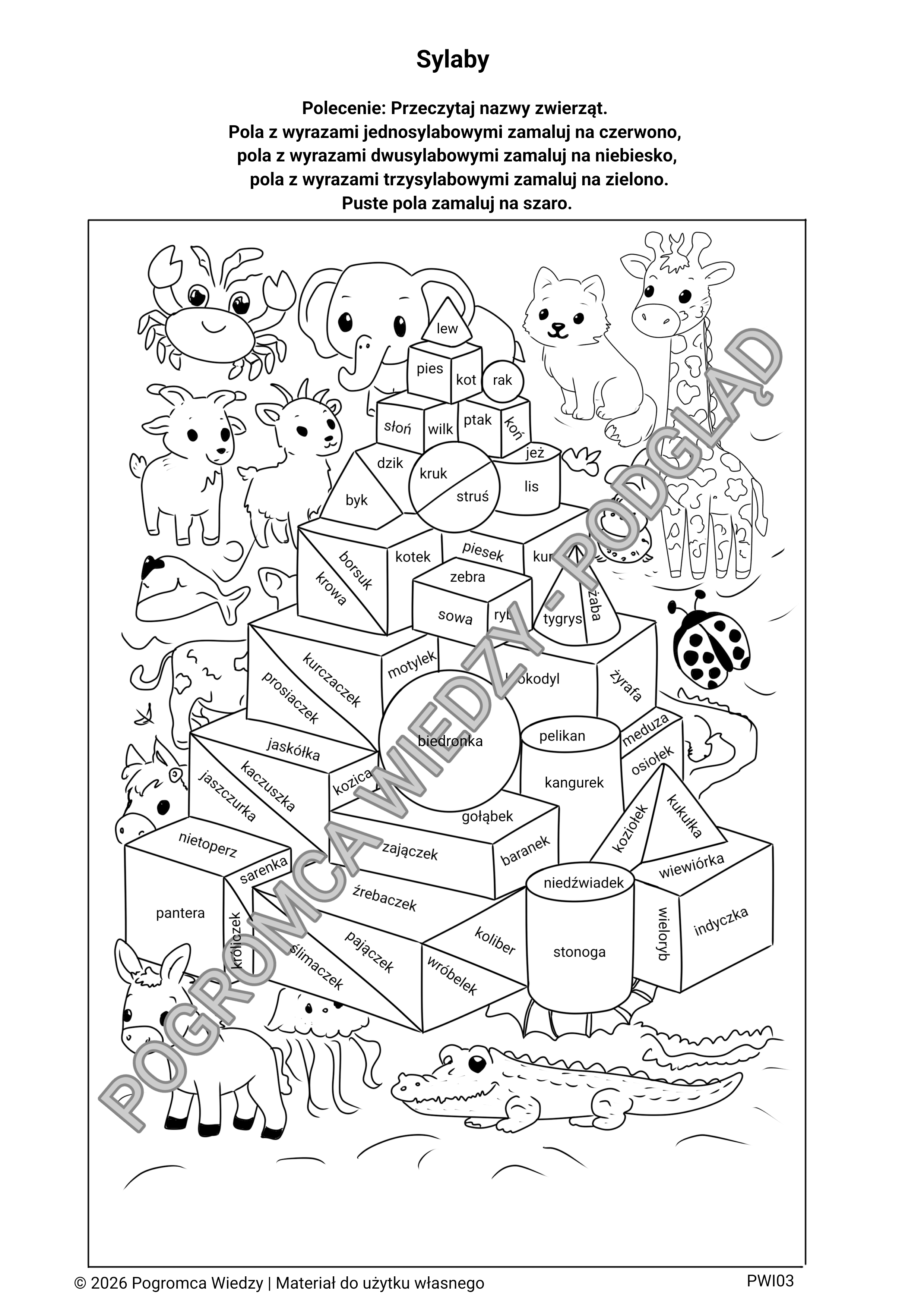 „Sylaby” to karta pracy w formie kolorowanki edukacyjnej przeznaczona dla klas 3–4. Zadaniem uczniów jest odczytanie nazw zwierząt, określenie liczby sylab w wyrazie oraz pokolorowanie pól zgodnie z poleceniem (wyrazy jednosylabowe, dwusylabowe i trzysylabowe). Ćwiczenie utrwala umiejętność dzielenia wyrazów na sylaby, rozwija analizę słuchową, koncentrację oraz dokładność pracy. Atrakcyjna forma graficzna zwiększa zaangażowanie uczniów i sprawia, że powtórka materiału staje się przyjemna. Materiał sprawdzi się podczas wprowadzania tematu, na utrwalenie wiadomości, zajęcia wyrównawcze oraz jako spokojna praca indywidualna. Format: PDF do druku Liczba stron: 1