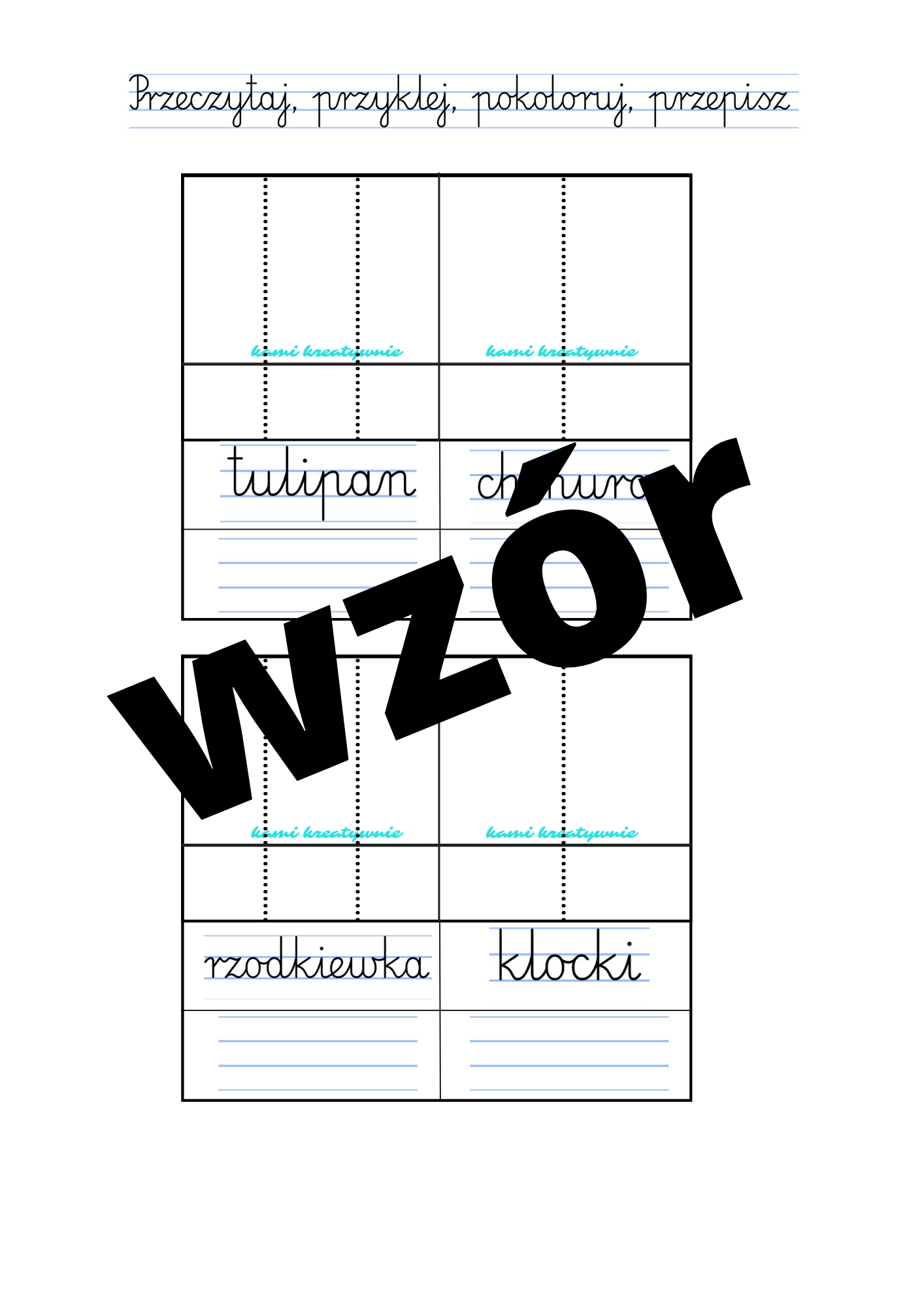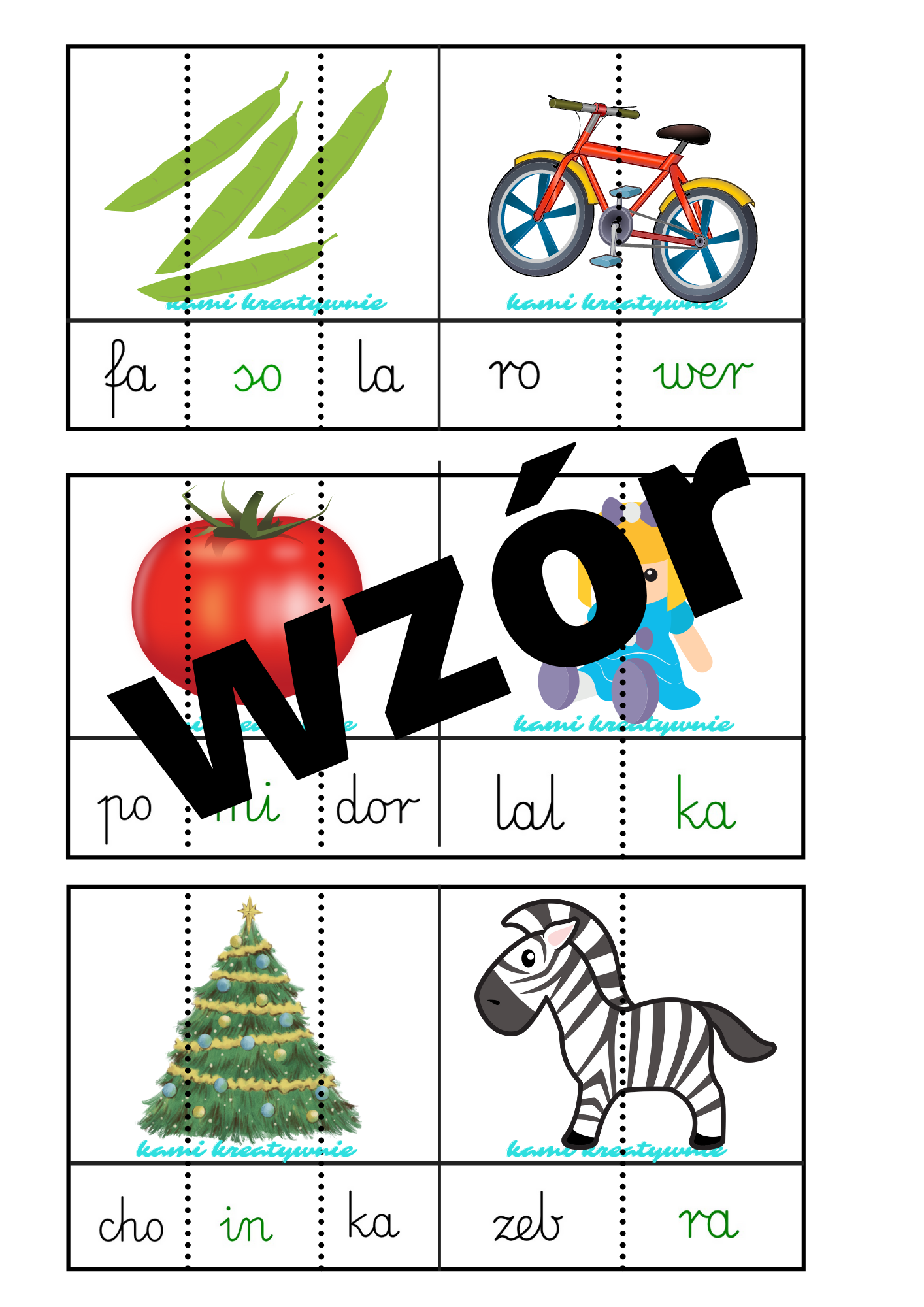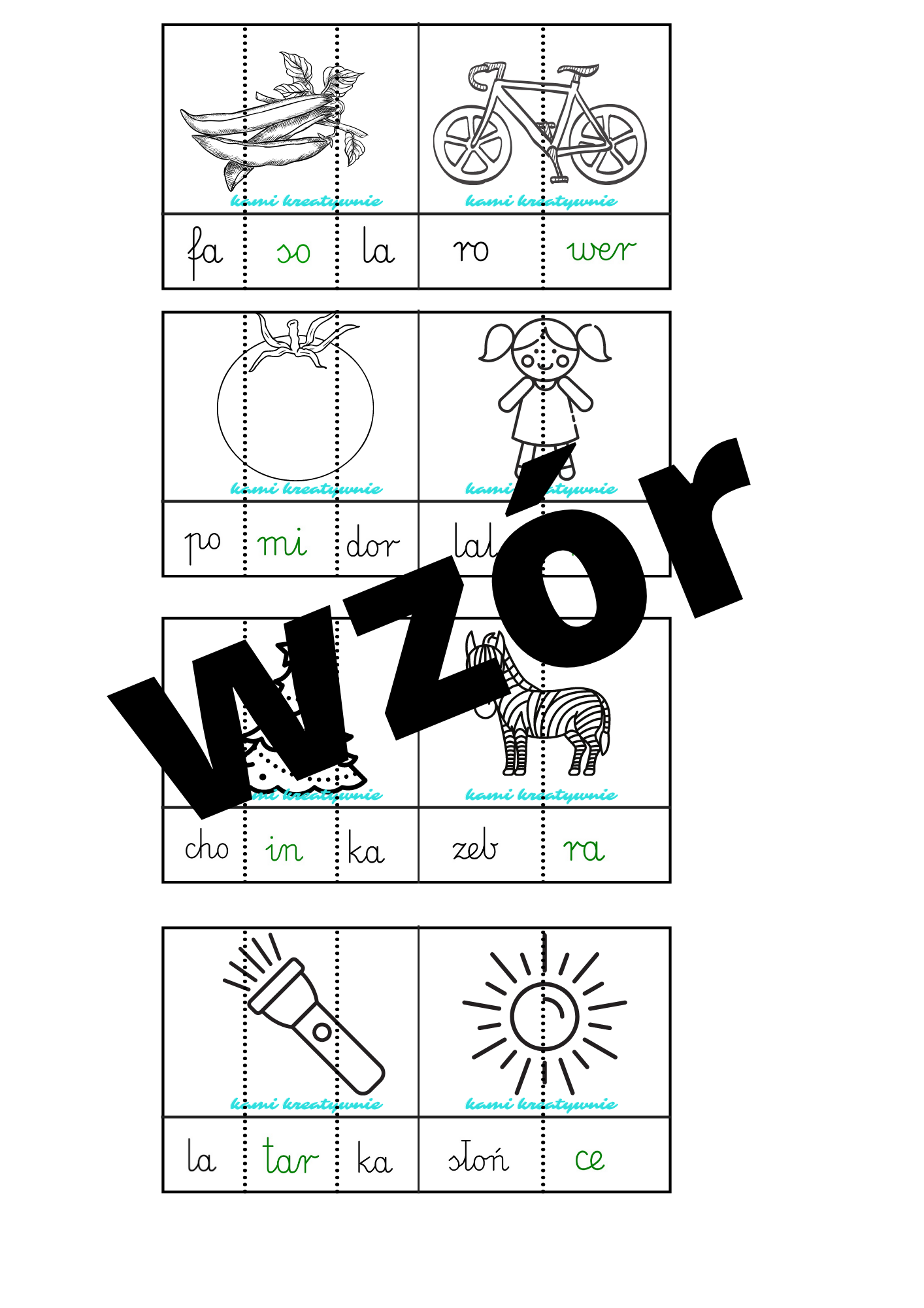 Dodatkowo dostępne są karty pracy- złóż wyraz, przyklej sylaby dopasowując do odpowiednich wyrazów, pokoloruj i przepisz wyraz.