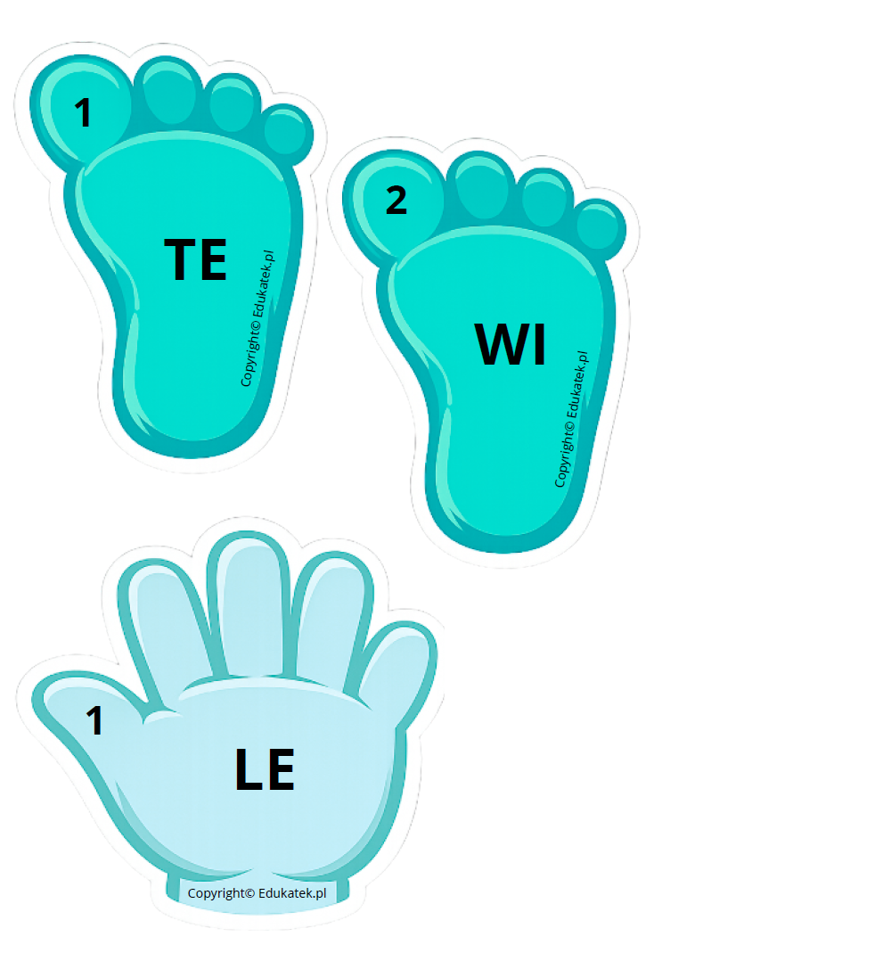 W skład zestawu wchodzą 24 strony (6 kompletów) do samodzielnego wydrukowania. Każdy komplet zawiera karty z sylabami umieszczonymi na stopach i dłoniach oraz gotowe sekwencje zadań o narastającym poziomie trudności.