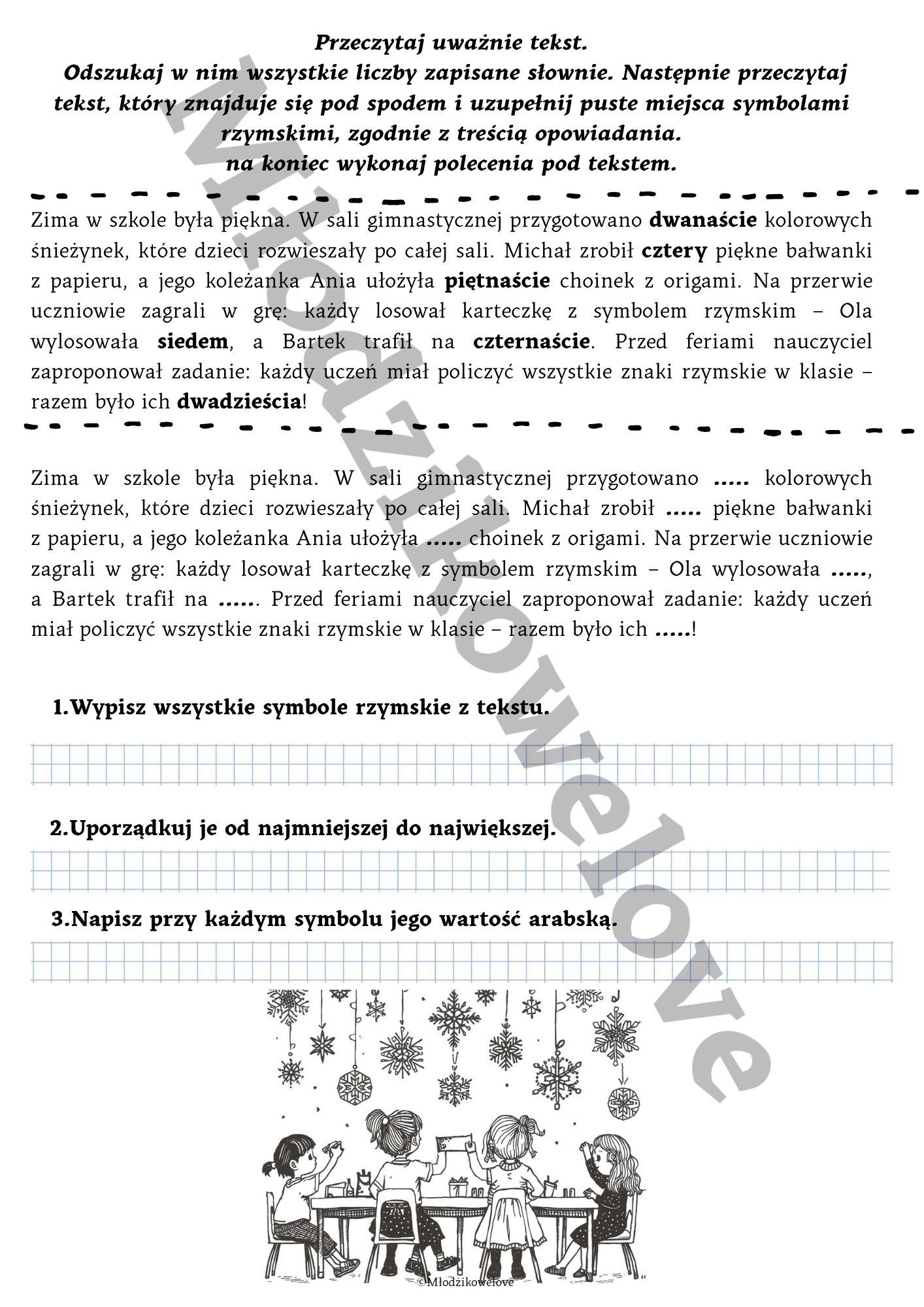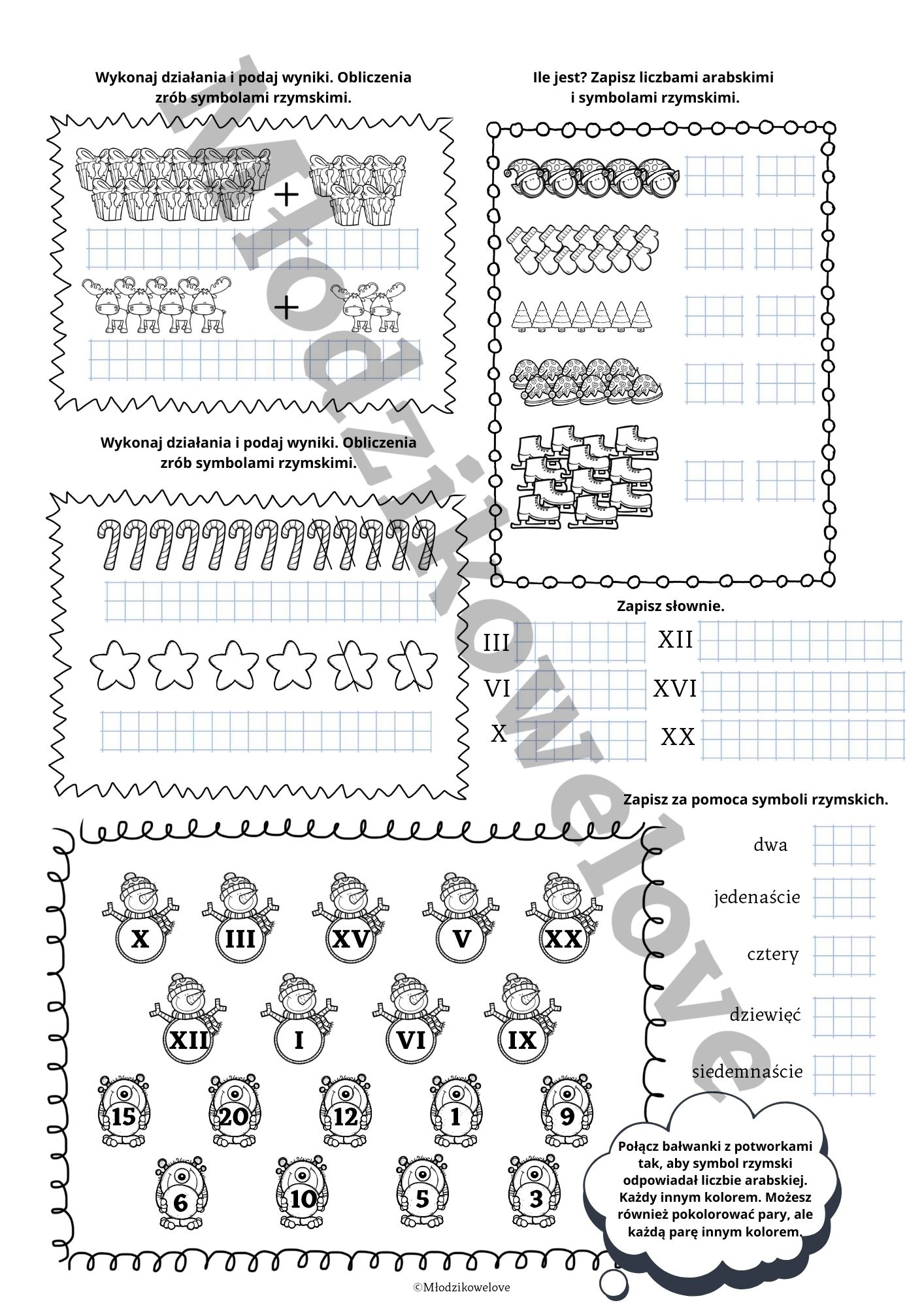 ✔️ zadanie „Zimowy plecak ucznia” – kreatywna karta pracy oparta na porządkowaniu, porównywaniu i interpretowaniu liczb zapisanych rzymsko