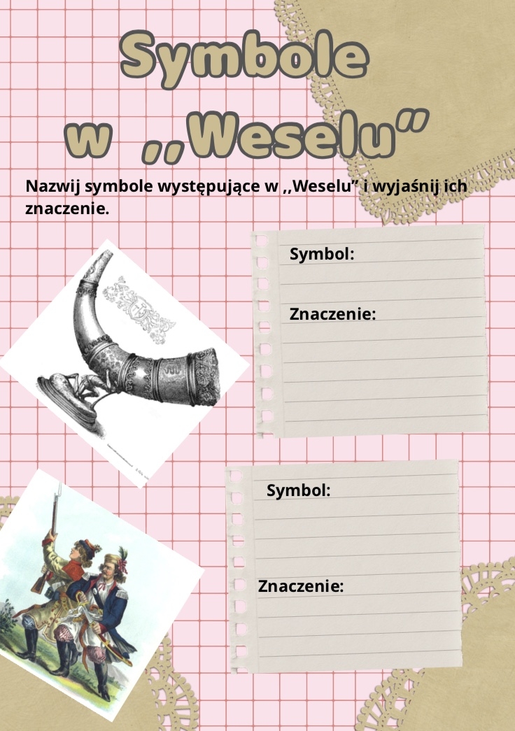 Witam. Opracowane przeze mnie trzy karty pracy mają pomóc nauczycielowi w przybliżeniu uczniom symboliki ,,Wesela" Stanisława Wyspiańskiego. Ładna szata graficzna zachęci do prób rozszyfrowania symbolicznych znaczeń złotego rogu, kaduceusza, złotej podkowy, chocholego tańca, czapki z pawimi piórami, Dzwonu Zygmunta. Polecam i zapraszam do kupna.