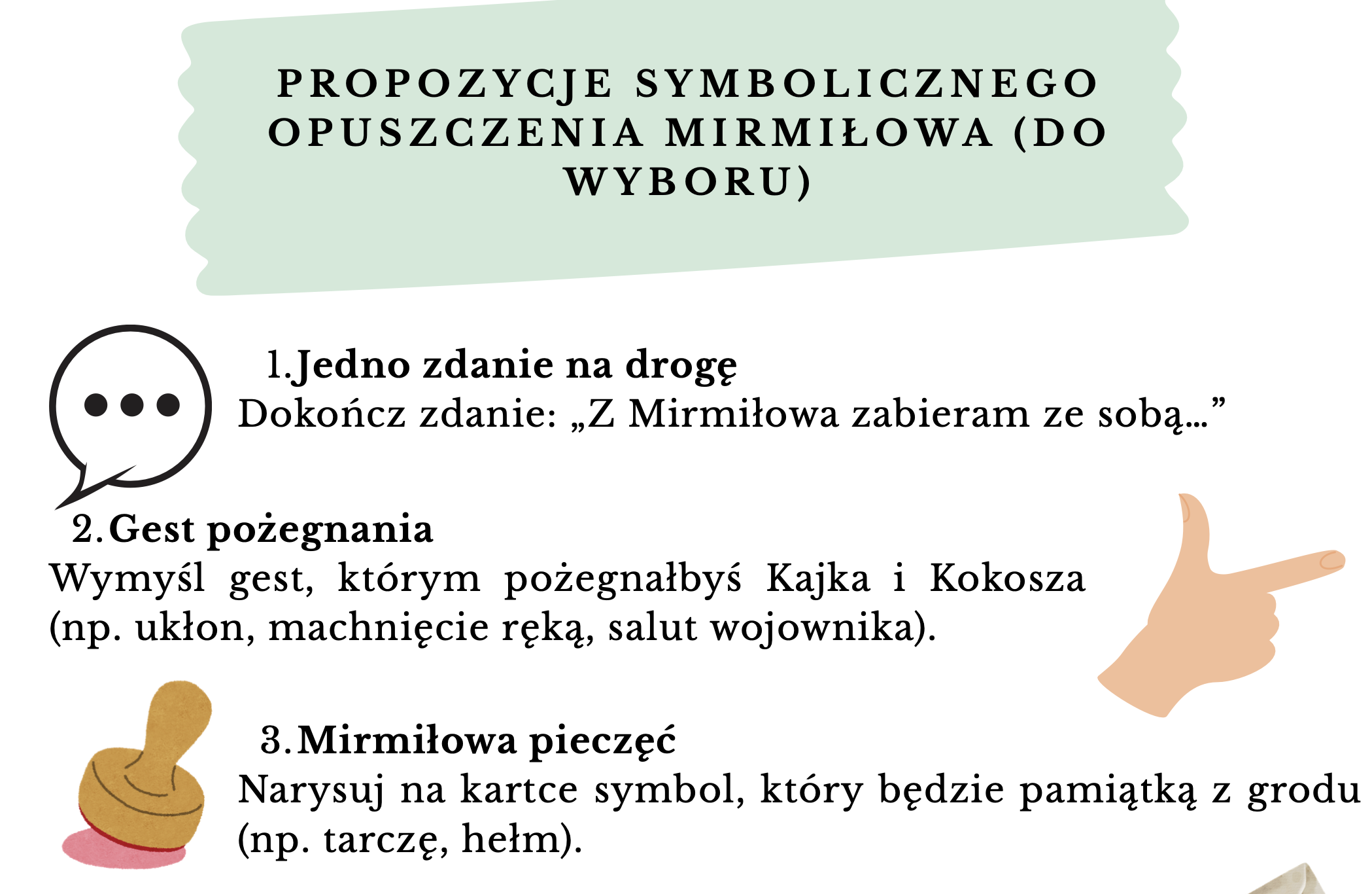 Symboliczne opuszczenie Mirmiłowa to kreatywne ćwiczenie podsumowujące lekcję o lekturze Kajko i Kokosz. Uczniowie mają do wyboru 8 różnych sposobów zakończenia zajęć, np. dokończenie zdania, wymyślenie gestu lub narysowanie symbolu, który pokazuje, jak opuszczają Mirmiłowo. Materiał angażuje wyobraźnię, pozwala na refleksję nad wydarzeniami z komiksu oraz rozwija kreatywne myślenie.