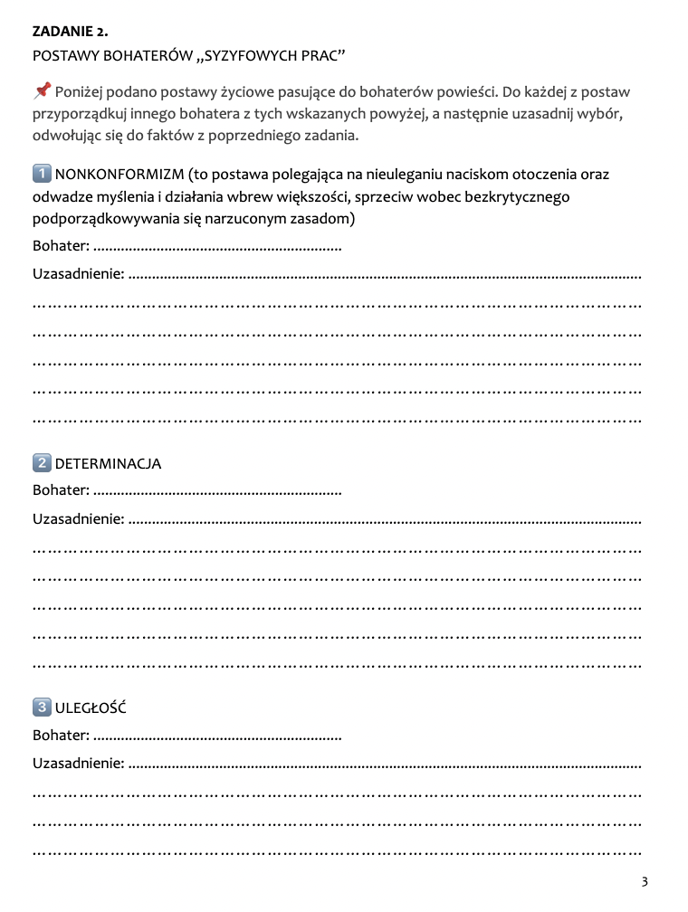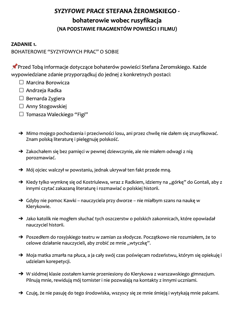 „Syzyfowe prace – bohaterowie wobec rusyfikacji. Praca z fragmentami powieści i filmem” W zestawie znajdują się: ✔ zadanie „Bohaterowie o sobie” – 27 wypowiedzi do przyporządkowania konkretnym postaciom ✔ analiza postaw bohaterów:   – nonkonformizm   – determinacja   – patriotyzm   – odpowiedzialność   – uległość ✔ zadanie dotyczące przejawów rusyfikacji ✔ interpretacja znaczenia tytułu „Syzyfowe prace” ✔ karta pracy + klucz odpowiedzi 📚 Materiał oparty jest na następujących fragmentach: – sprzeciw Tomasza Waleckiego (lekcja historii), – rozdział poświęcony Andrzejowi Radkowi, – przybycie Bernarda Zygiera i lekcja języka polskiego, – spotkania młodzieży na „górce” u Gontali. 📽️ Zadania można realizować na podstawie lektury oraz filmu. 📖 Wszystkie fragmenty dostępne są na Wolnych Lekturach. 🎯 Materiał: ✔ zgodny z aktualną podstawą programową i wymaganiami egzaminacyjnymi ✔ gotowy do użycia na lekcji ✔ idealny do powtórzenia przed egzaminem ✔ rozwija analizę, argumentowanie i myślenie przyczynowo-skutkowe