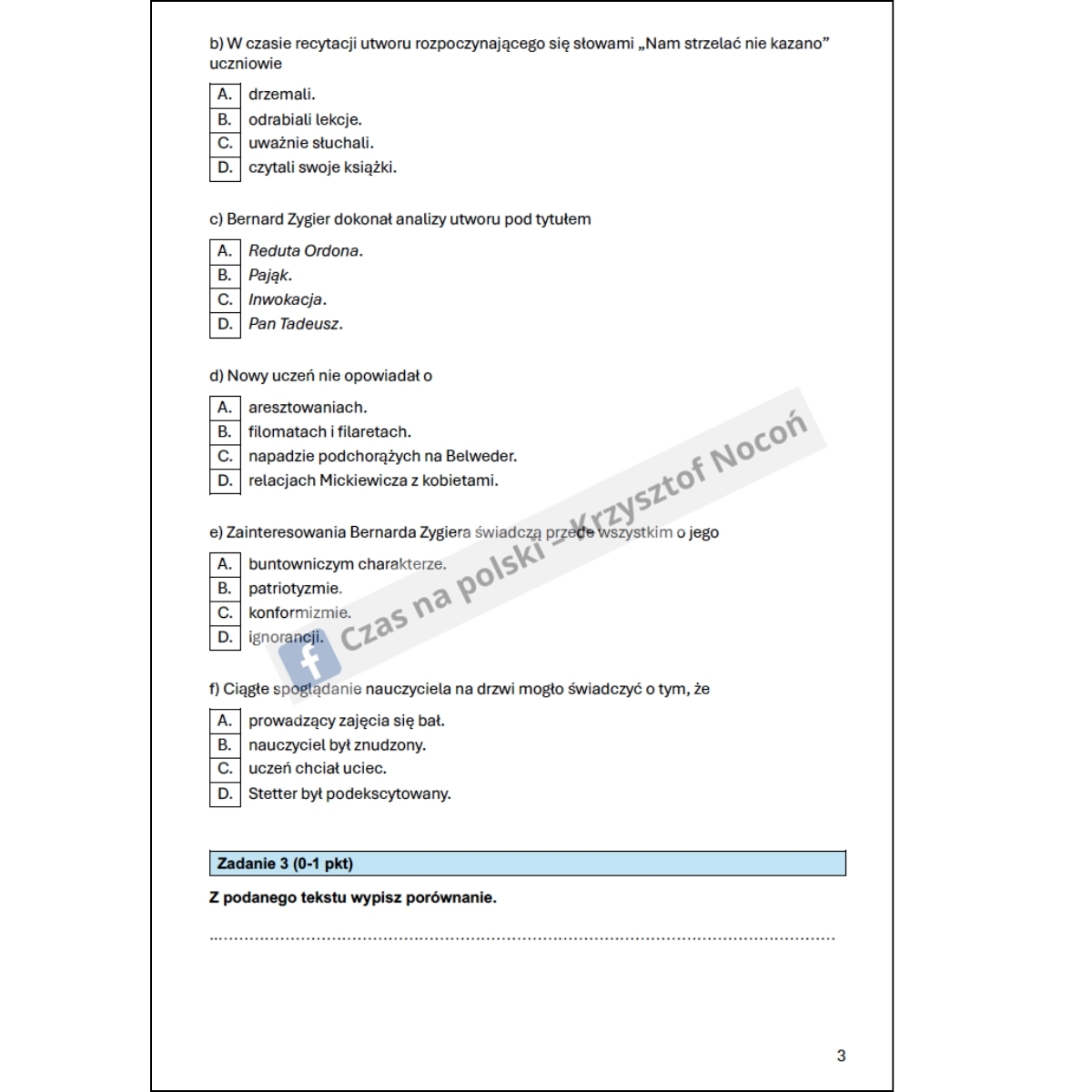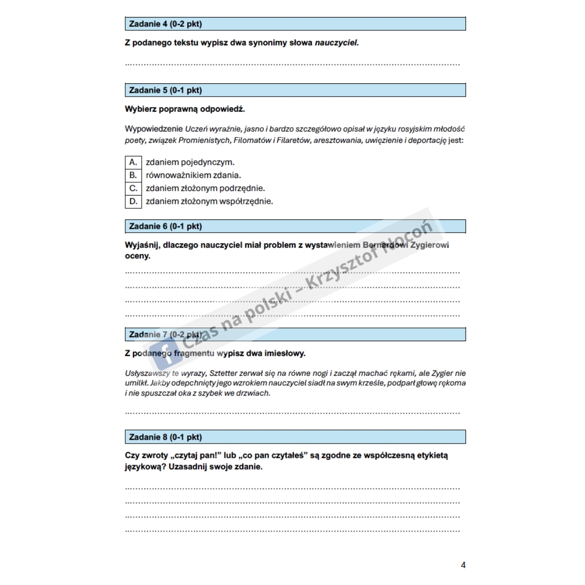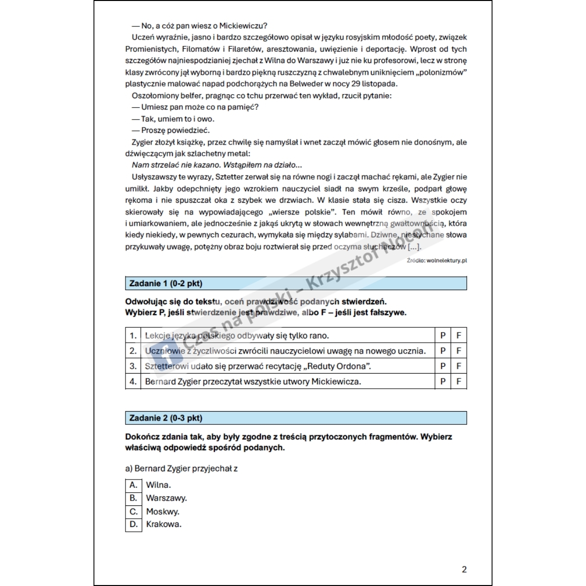 Zadania sprawdzają umiejętność czytania ze zrozumieniem oraz wiedzę i inne umiejętności wynikające z podstawy programowej (m.in. rozpoznawanie wypowiedzeń, imiesłowów, synonimów; znajomość etykiety językowej), dlatego test świetnie sprawdzi się jako materiał powtórzeniowy przed egzaminem ósmoklasisty.