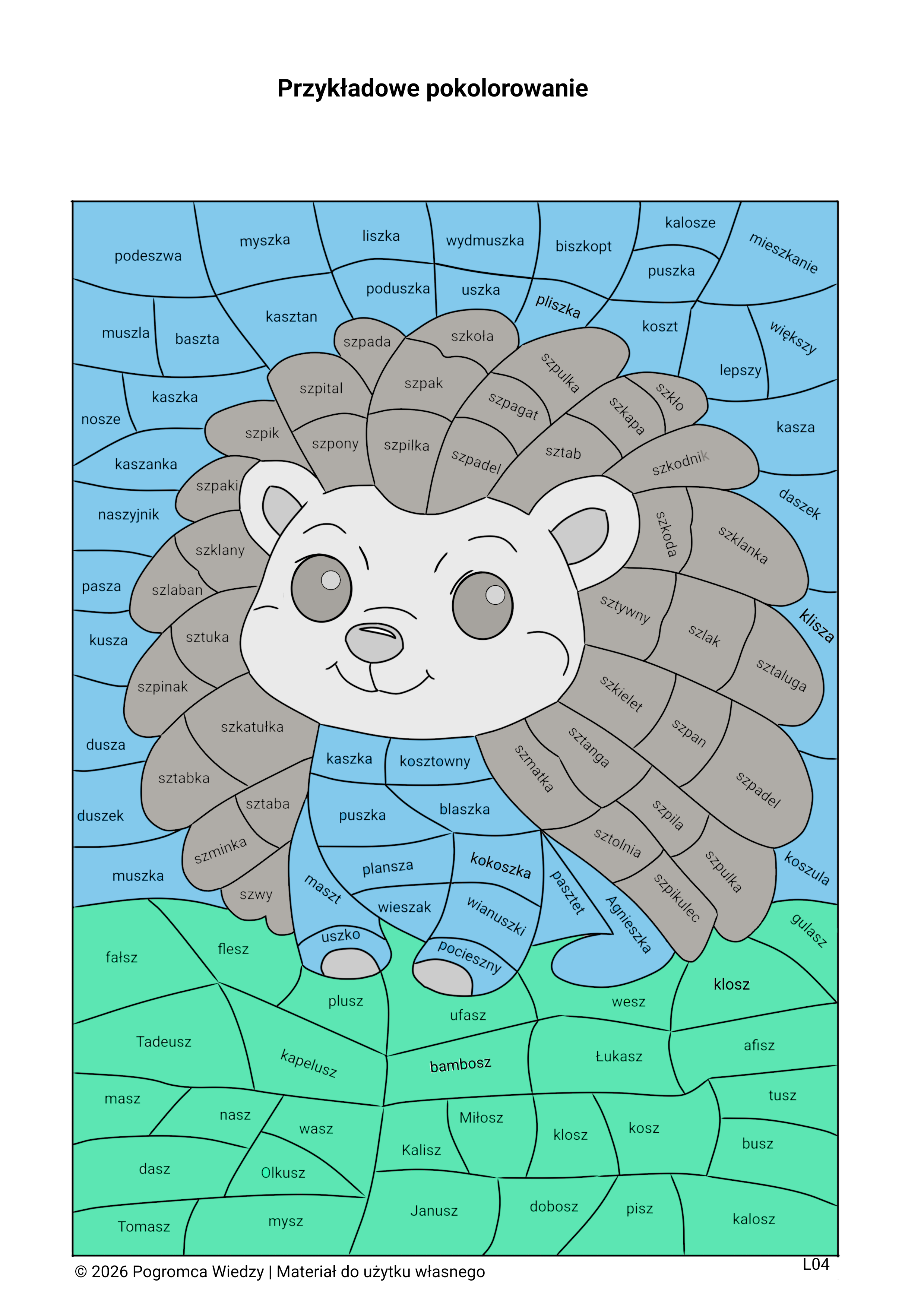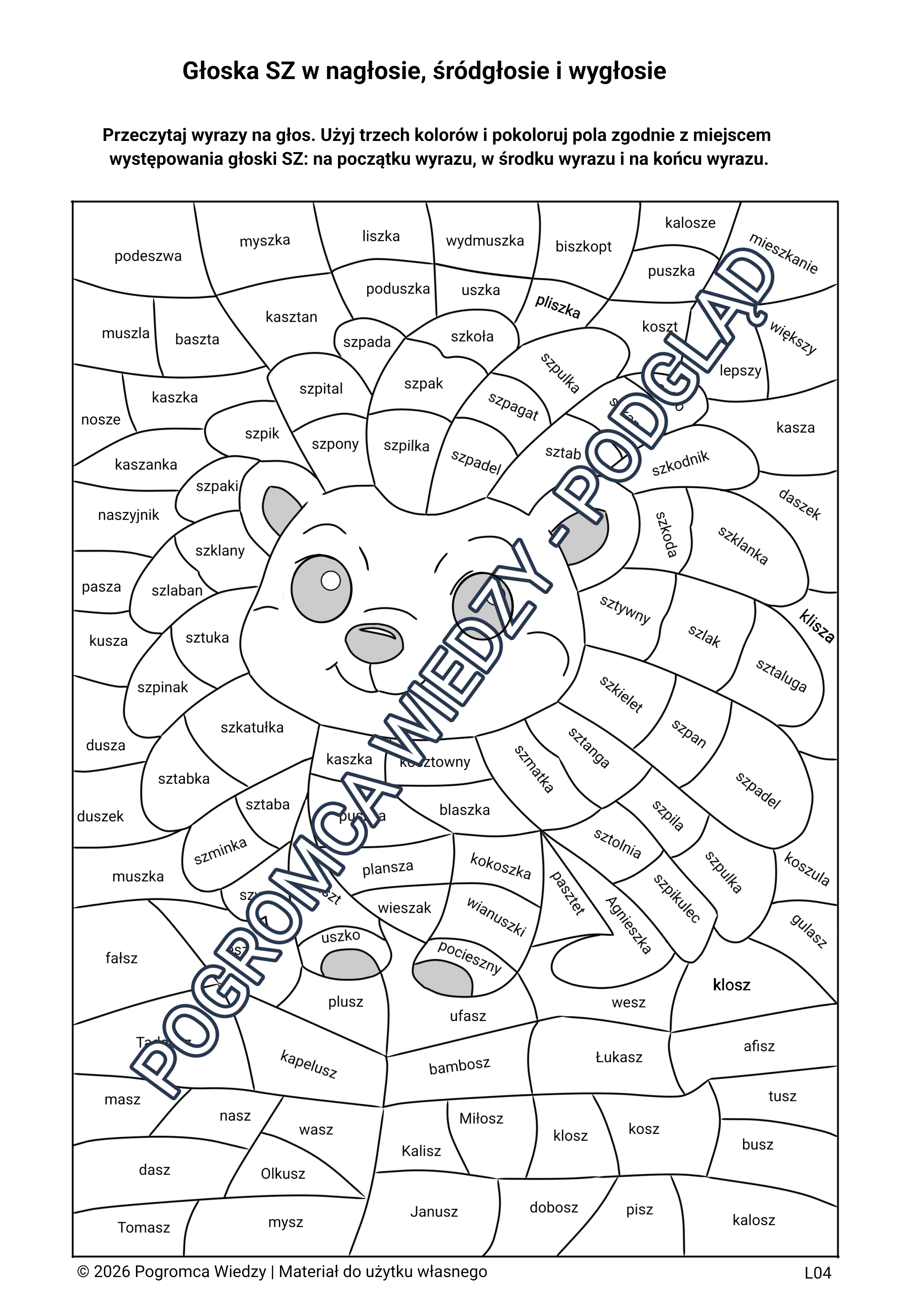 Karta pracy utrwalająca głoskę SZ w nagłosie, śródgłosie i wygłosie. Zadaniem ucznia jest odczytanie wyrazów oraz pokolorowanie pól trzema kolorami – zgodnie z miejscem występowania głoski w wyrazie. Ćwiczenie rozwija świadomość fonologiczną, wspiera poprawną wymowę oraz utrwala analizę słuchową. Materiał sprawdzi się w pracy logopedycznej, na zajęciach korekcyjno-kompensacyjnych oraz w edukacji wczesnoszkolnej. Do karty dołączony jest klucz odpowiedzi.