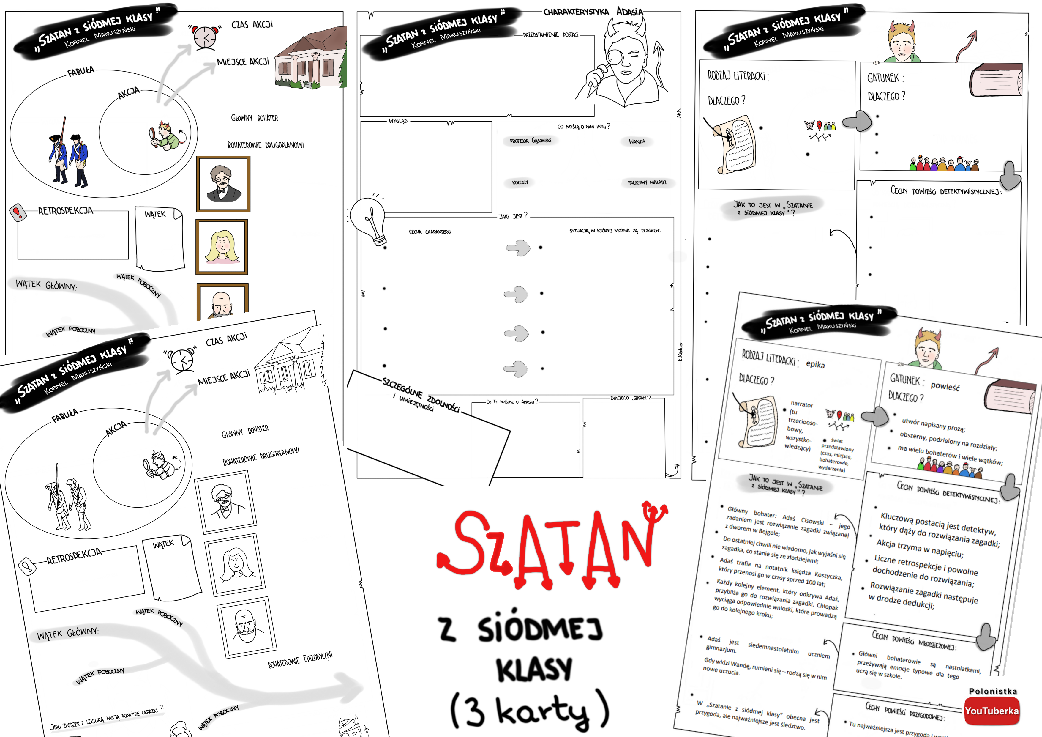 W zestawie znajdują się trzy karty w trzech wersjach (pusta, kolorowa i w przykładowy sposób wypełniona): 1. Karta ułatwiająca charakterystykę Adasia Cisowskiego. 2. Świat przedstawiony w lekturze. 3. Rodzaj i gatunek literacki.