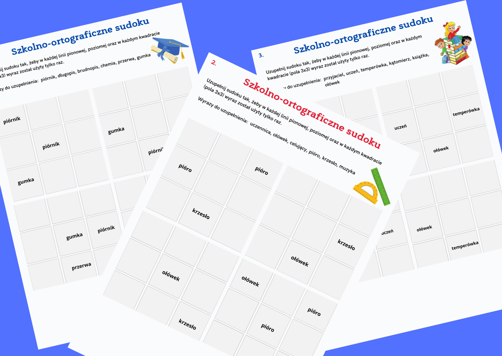 W skład zestawu wchodzi 6 kart do wydrukowania (ostania karta jest pusta, do dowolnego uzupełnienia). Na każdej karcie znajdują się wyrazy związane ze szkołą i zawierające trudność ortograficzną. Zabawa polega na takim ułożeniu sudoku, żeby w każdej linii pionowej, poziomej oraz w każdym kwadracie pola (3x3) wyraz był użyty tylko raz.