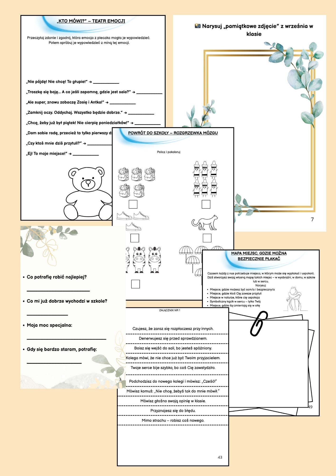 ✅ Karty emocji, bajki terapeutyczne z zadaniami(„Miś Bąbelek i Tęczowy Plecak”– bajka o odwadze, powrocie do szkoły i nowych emocjach, „Dzień, w którym Strach zgubił okulary”– bajka o oswajaniu lęków i zyskaniu odwagi, „Wzruszek i Płaczunia – przyjaciele z Łezkowej Krainy”– bajka o smutku, empatii i akceptacji uczuć ) ✅Kolorowanki antystresowe z pytaniami
