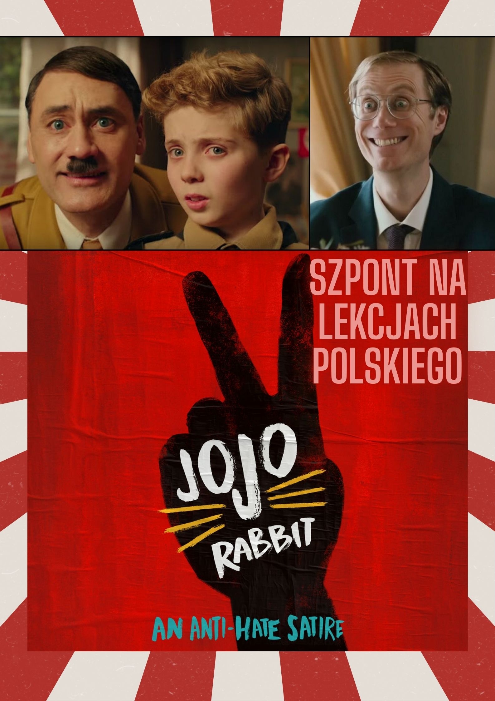Szpont nr 1: II wojna światowa oczami 10-letniego Jojo - członka nazistowskiej organizacji dla młodzieży Jungvolk. "Jojo Rabbit" to film, który znajduje się w podstawie programowej szpontu na lekcjach języka polskiego. Jest mądry, zabawny, poruszający, a dodatkowo ma świetny soundtrack. W satyryczny sposób ukazuje realia nazistowskich Niemiec, poruszając tematy propagandy, manipulacji, dojrzewania, tolerancji i człowieczeństwa. Zadania zawarte w karcie pracy pomagają uczniom zrozumieć mechanizmy indoktrynacji, rolę humoru i ironii w przekazie filmowym oraz przemianę głównego bohatera. Materiał zachęca do krytycznego myślenia, refleksji moralnej oraz dyskusji na temat uprzedzeń i empatii.