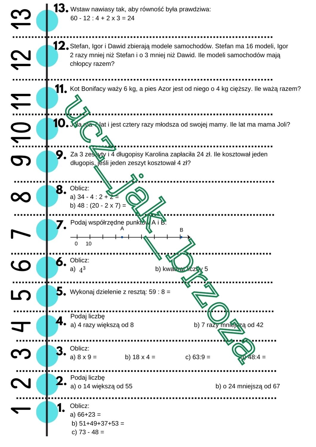 Sztafeta zadaniowa "Liczby i działania", to ciekawy sposób powtórzenia wiadomości dla uczniów klasy 4. Dzięki 13 zadaniom uczniowie powtórzą: rachunki pamięciowe, kolejność działań, oś liczbową oraz poćwiczą rozwiązywanie zadań tekstowych.