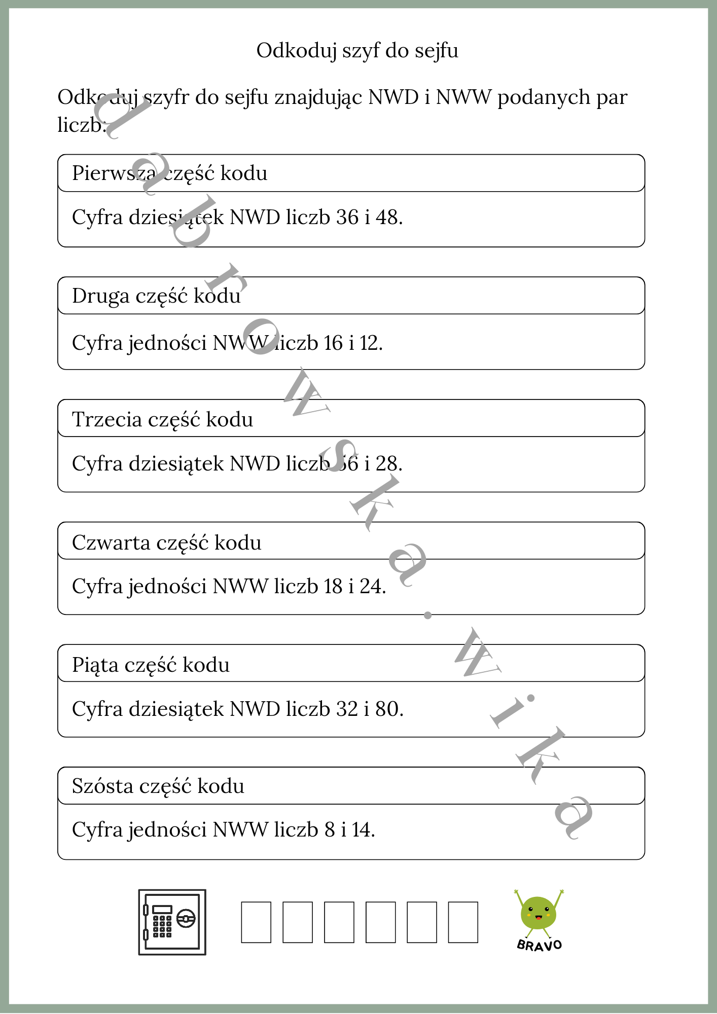 Zadaniem ucznia jest odkodowanie szyfru do sejfu, obliczając NWD (największy wspólny dzielnik) i NWW (najmniejszą wspólną wielokrotność) dla podanych par liczb. Kolejna część zadania polega na odczytaniu cyfr z odpowiednich miejsc (dziesiątek lub jedności) w wynikach oraz wpisaniu ich w odpowiednie pola, co pozwoli na uzyskanie pełnego kodu.