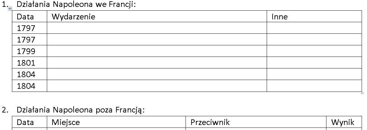 Materiał zawiera tabelę opisującą wydarzenia wewnątrz i poza Francją w czasach Napoleona Bonapartego oraz wyjaśnienie kluczowych pojęć. Materiał zawiera odpowiedzi.