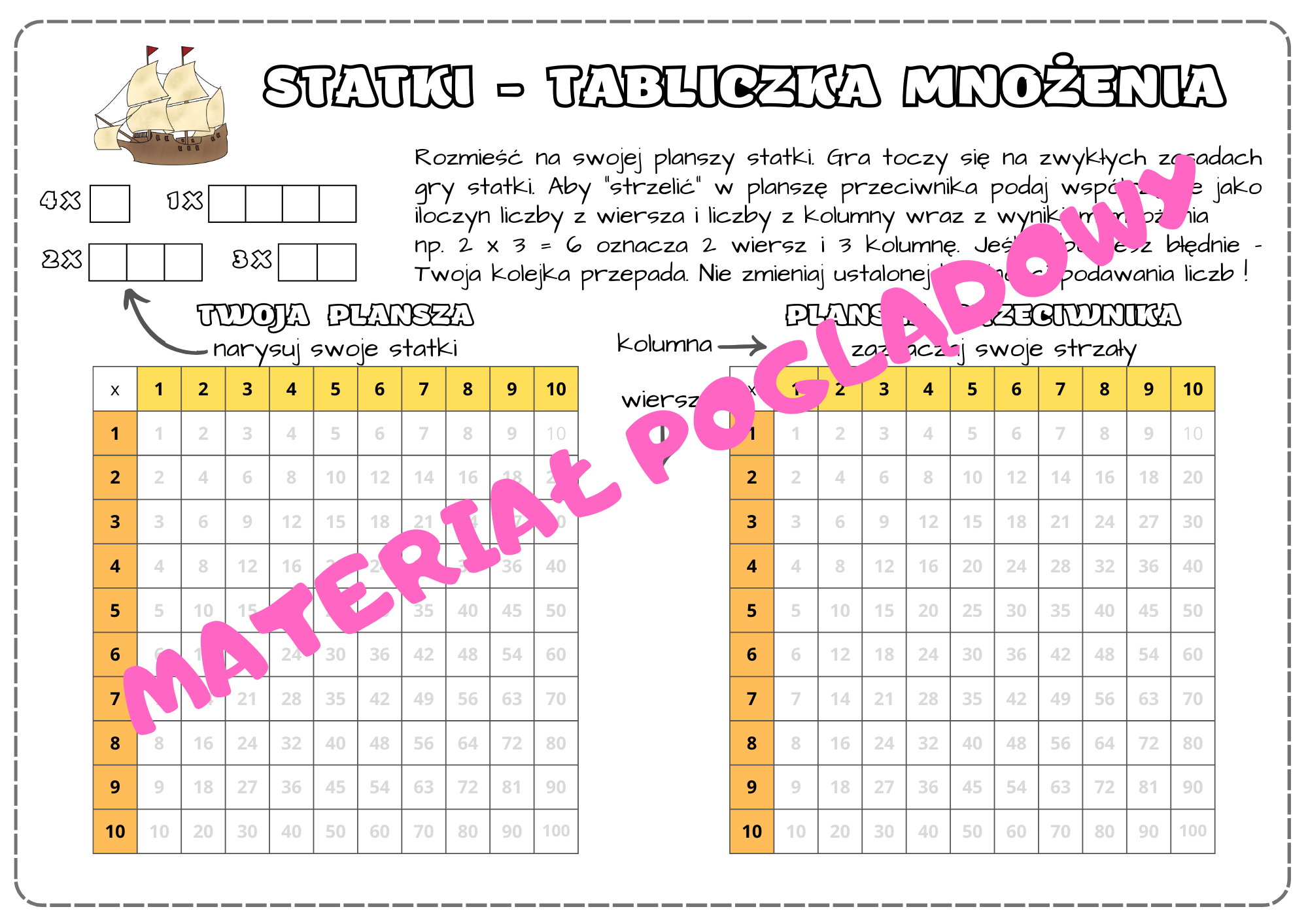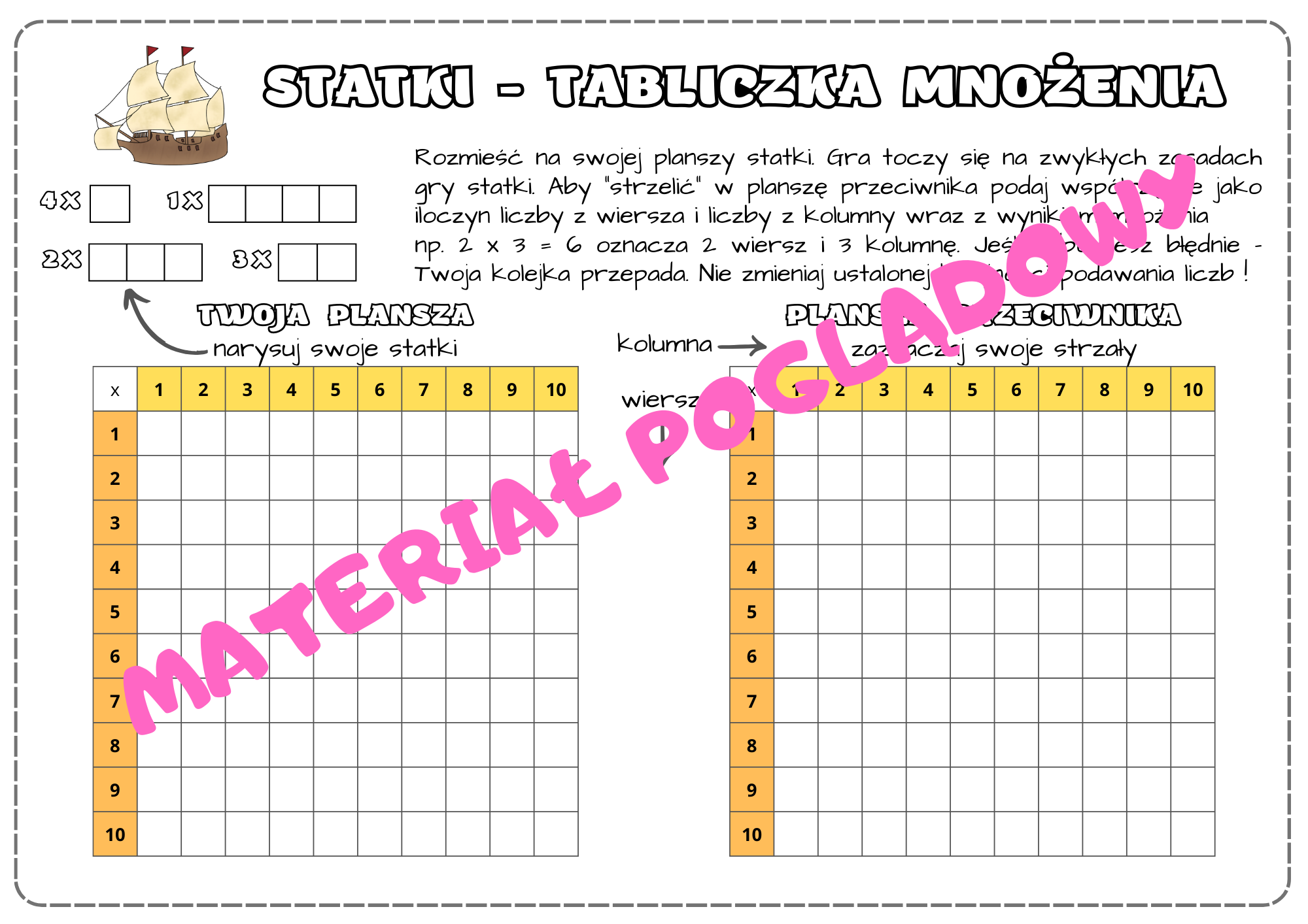 Materiał zawiera dwie wersje matematycznej gry statki. Dla młodszych uczniów można wykorzystać plansze z uzupełnioną tabliczką mnożenia, a dla starszych - pustą.