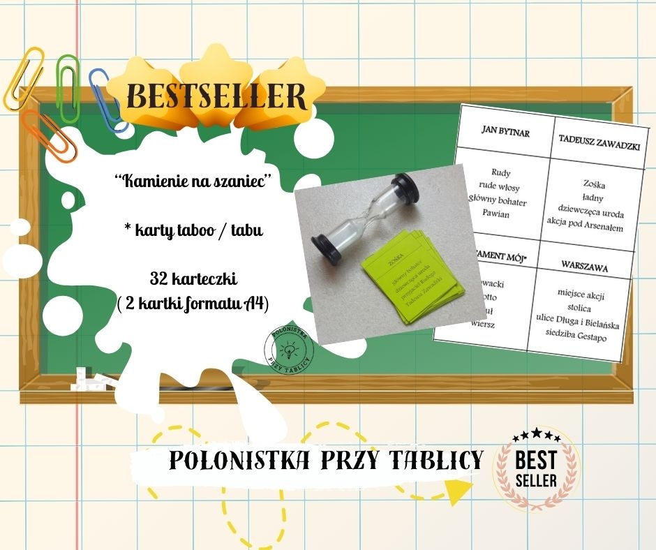 Taboo do gry na języku polskim, świetnie sprawdzi się zamiast kartkówki podczas omawiania lektury pt. "Kamienie na szaniec" i zaangażuje emocjonalnie uczniów. Mechanizm gry opisałam na blogu: