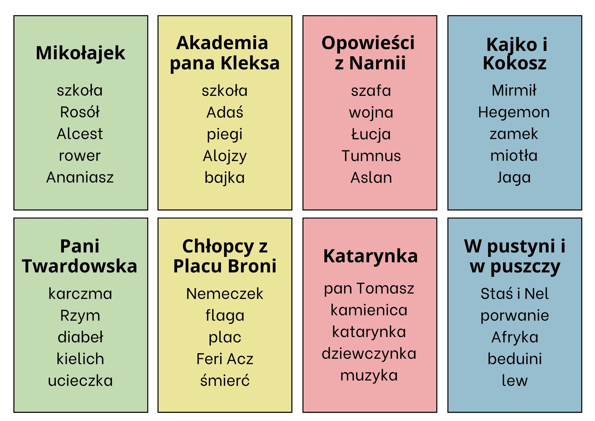 Gra taboo wykorzystująca lektury omawiane w klasach IV - VI. Doskonale nadaje się na lekcję powtórzeniową.