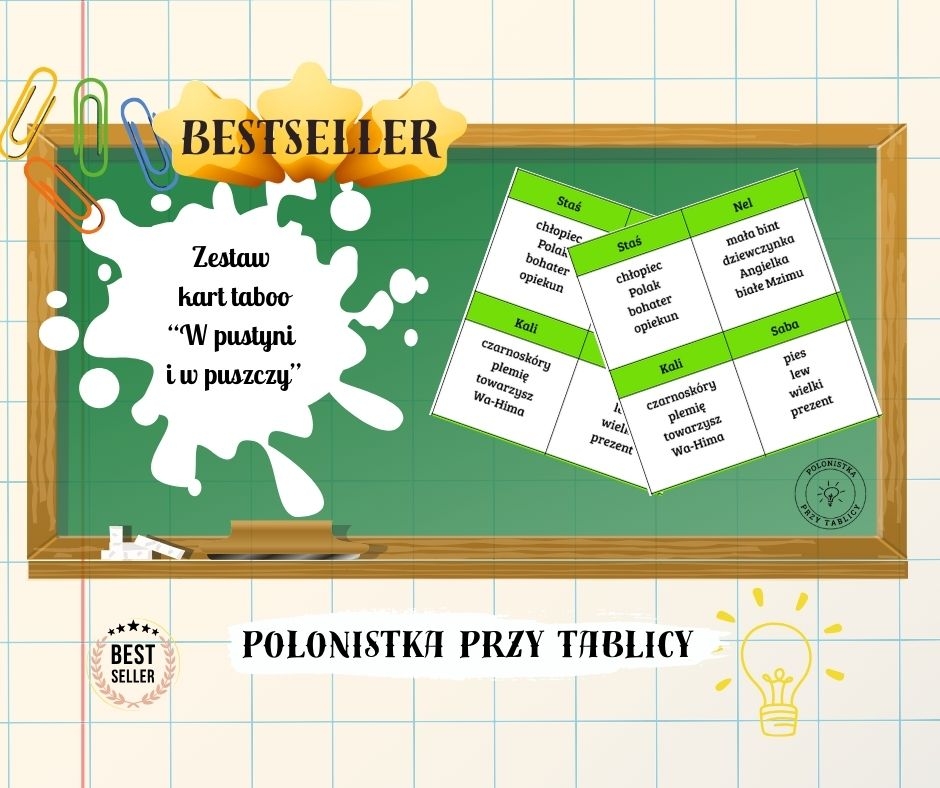 Taboo do gry na języku polskim, świetnie sprawdzi się zamiast kartkówki Uwapodczas omawiania lektury pt. „W pustyni i w puszczy” (lub oprócz niej) i zaangażuje emocjonalnie uczniów. Materiał zawiera 27 kart z wyrazami związanymi z powieścią H. Sienkiewicza. Mechanizm gry opisałam na blogu: