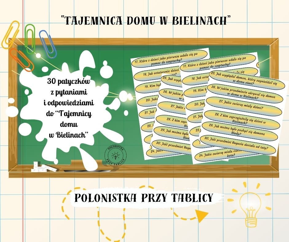 Materiał zawiera dwie strony formatu A4 z 30 pytaniami do treści poruszanych w utworze „Tajemnica domu w Bielinach” i odpowiedziami do nich. Pytania umieszczone są na „patyczkach”. Patyczki można wydrukować, wyciąć i nakleić na patyczki laryngologiczne lub wydrukować, zalaminować i wyciąć. Uczniowie losują pytanie dla siebie lub kolegi/koleżanki.