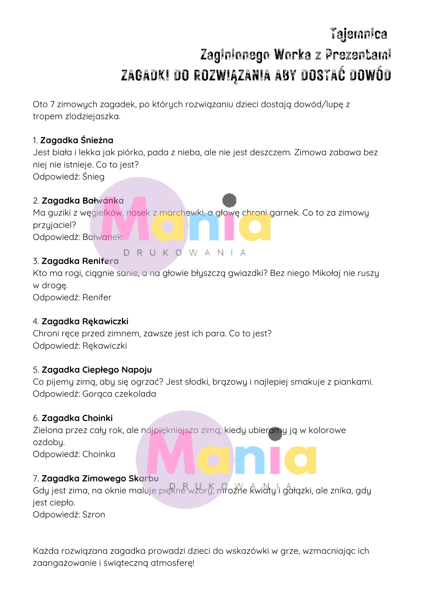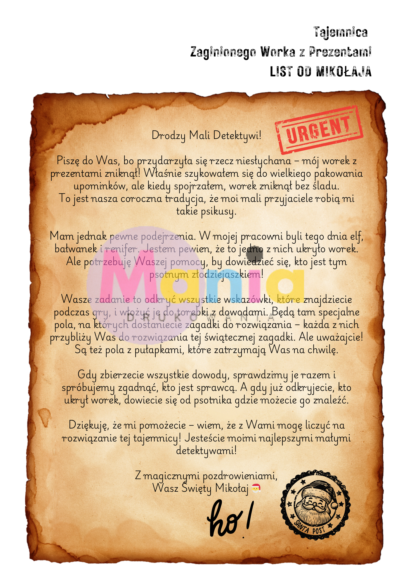 Dzieci pomagają Świętemu Mikołajowi odnaleźć zaginiony worek z prezentami. W trakcie gry będą zbierać wskazówki i dowody, które pozwolą im zidentyfikować, kto – elf, bałwanek czy renifer – jest sprawcą. Na koniec, korzystając ze zgromadzonych wskazówek, dzieci będą miały za zadanie odgadnąć, kto jest „złodziejaszkiem” i odkryć miejsce ukrycia worka.